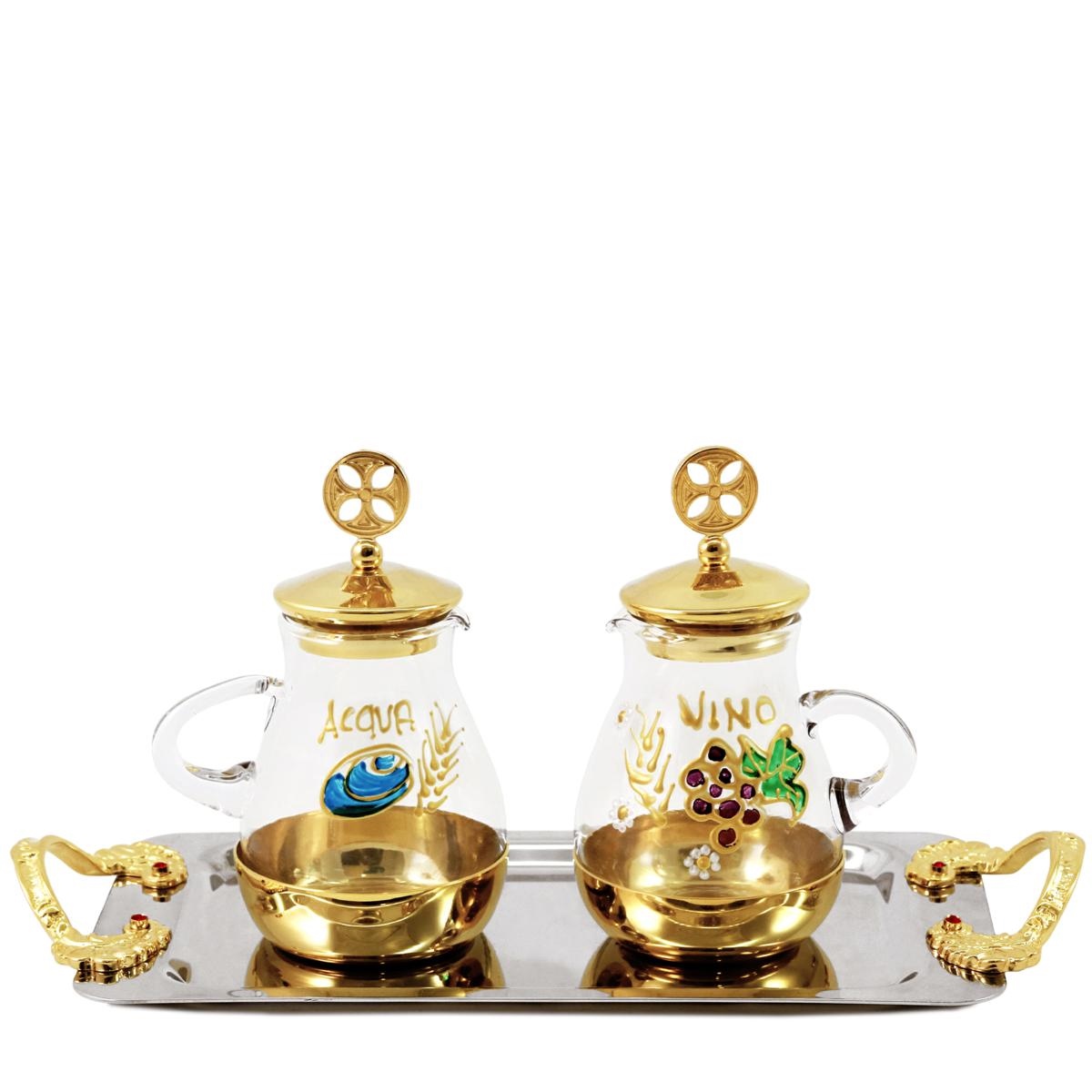 Servizio per Acqua e Vino bicolore con piatto in ottone tono argento e manici dorati e decorati con pietre rosse.