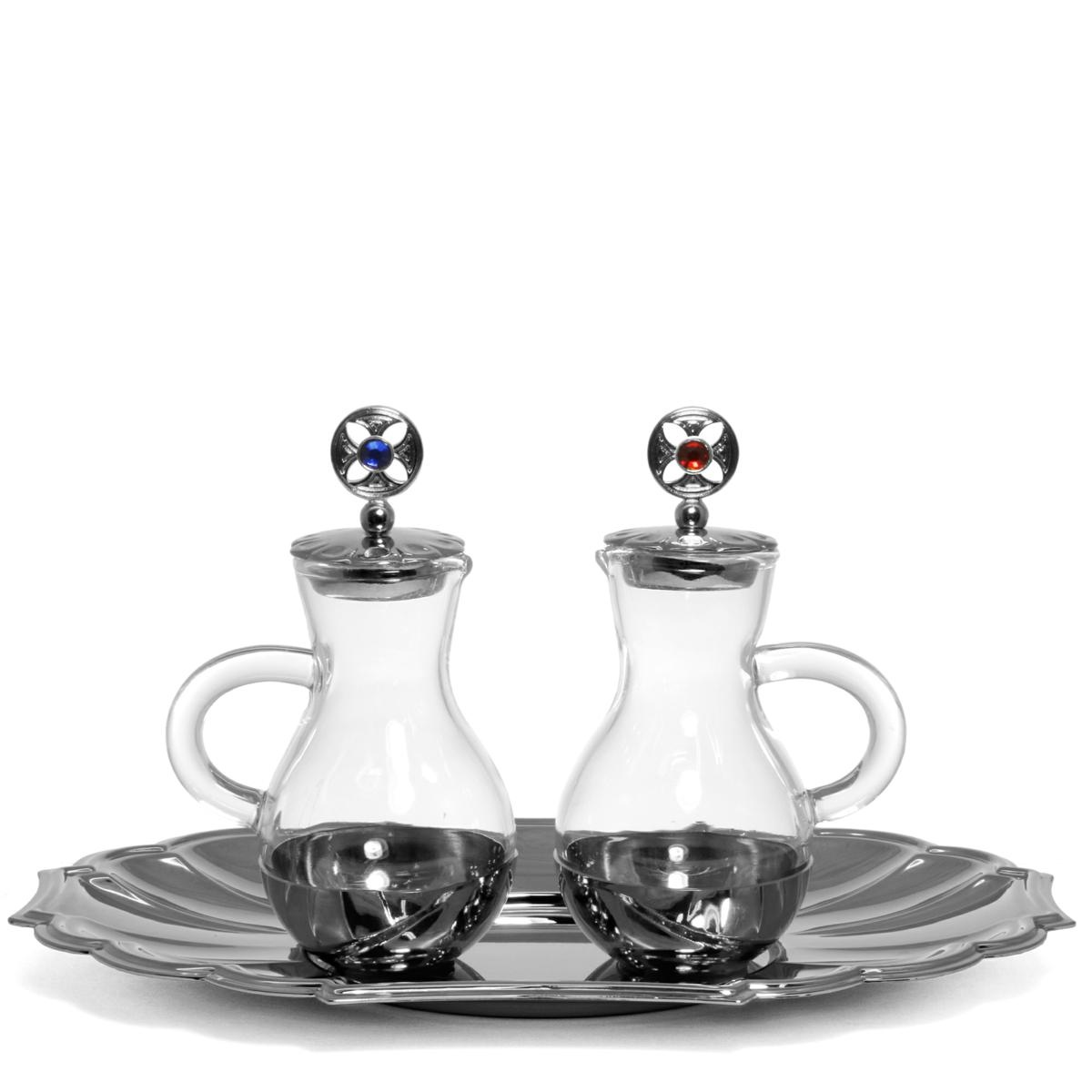 Servizio per Acqua e Vino in ottone tono argento, con piatto dalle linee morbide che ricordano una conchiglia.