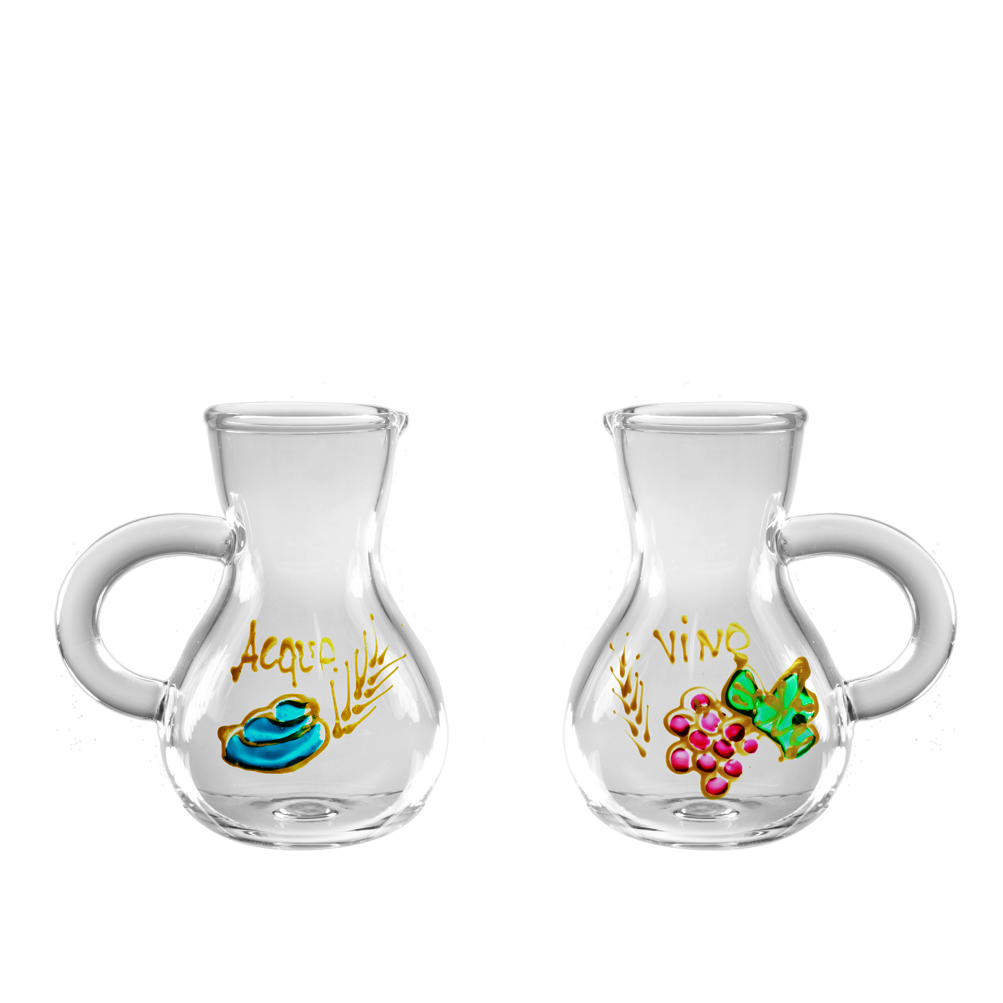 Brocchette in vetro modello "Parma" con decoro Acque e Vino dipinto a mano.