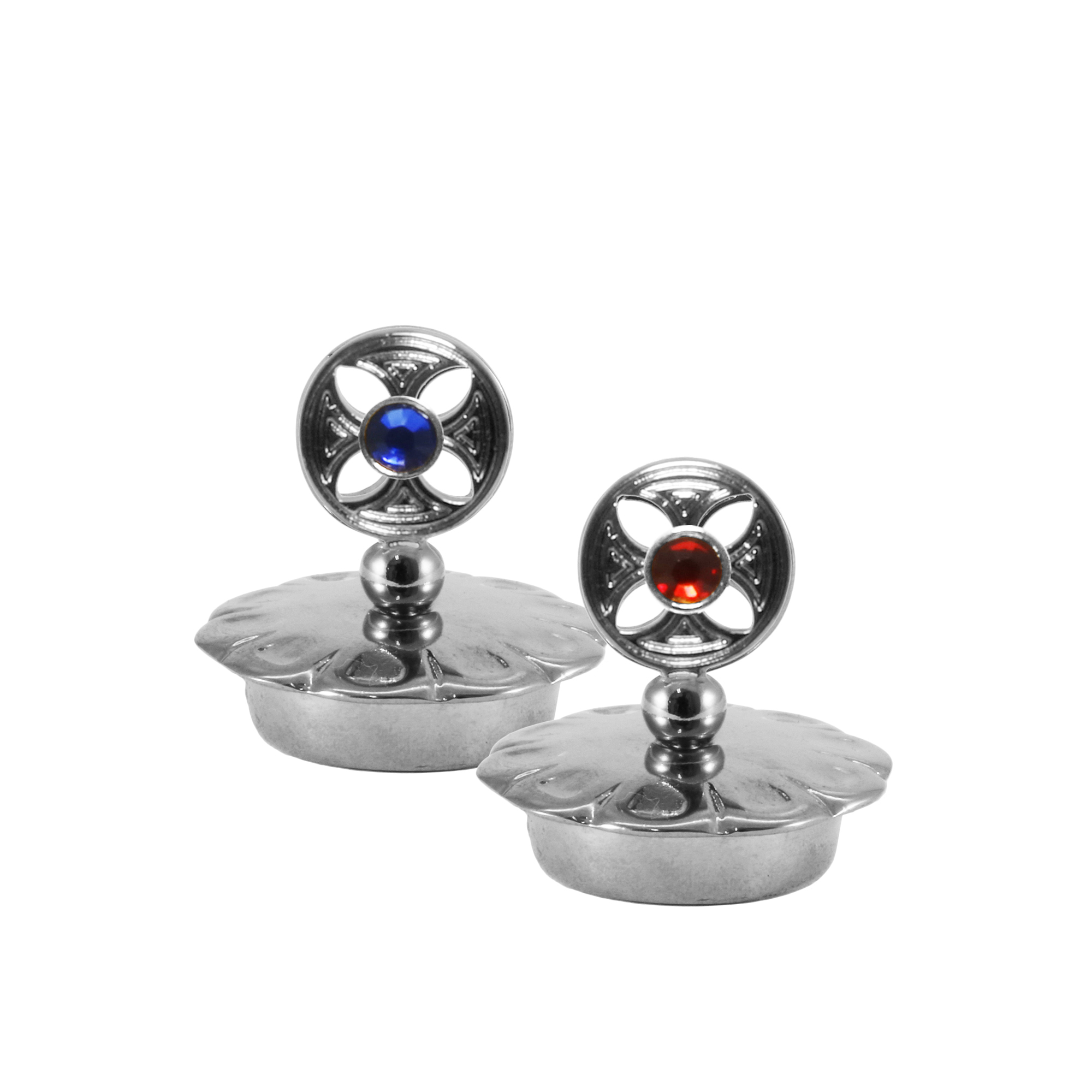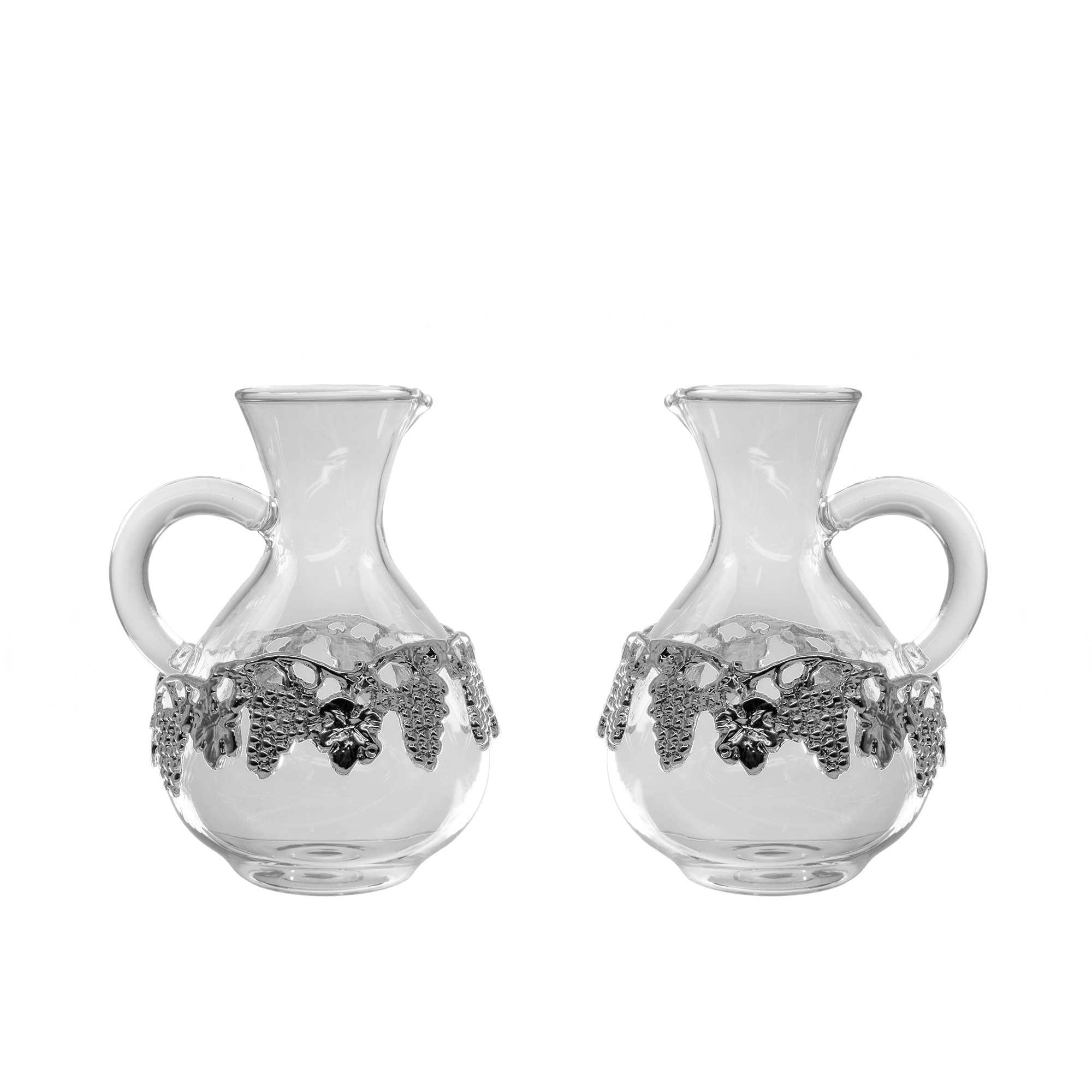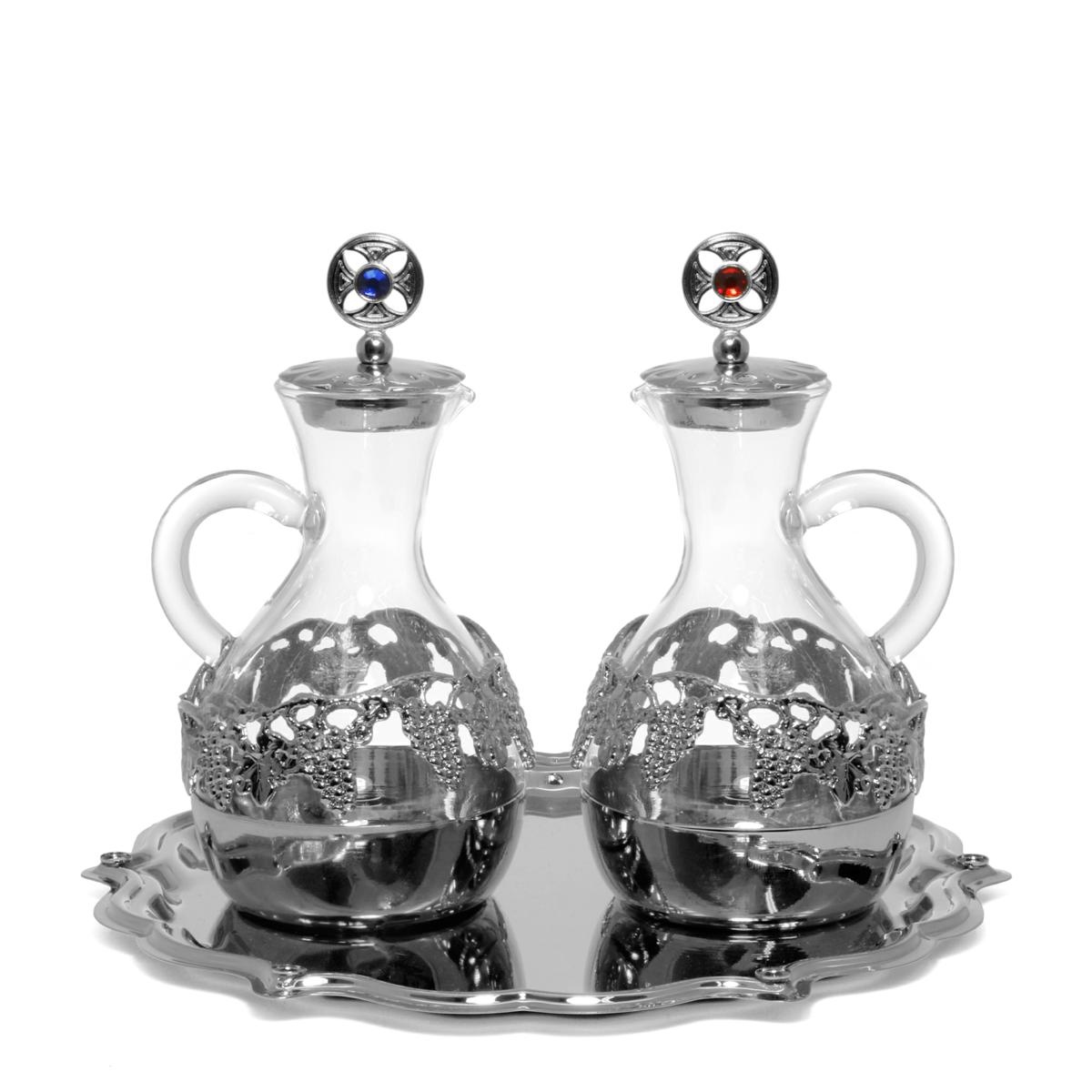 Water and wine set in silver-tone brass, with a distinctive, soft-lined plate. Plate featuring two practical bases that hold the jugs and keep them stable when moving. "Palermo" glass jugs with grape and vine leaf decoration. Caps with a round cross and inlaid red and blue stones, to distinguish water from wine.