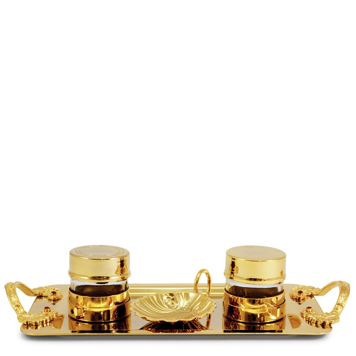 Servizio per Battesimo in ottone dorato . Il piattino ha due pratici manici con pietre rosse brillanti.