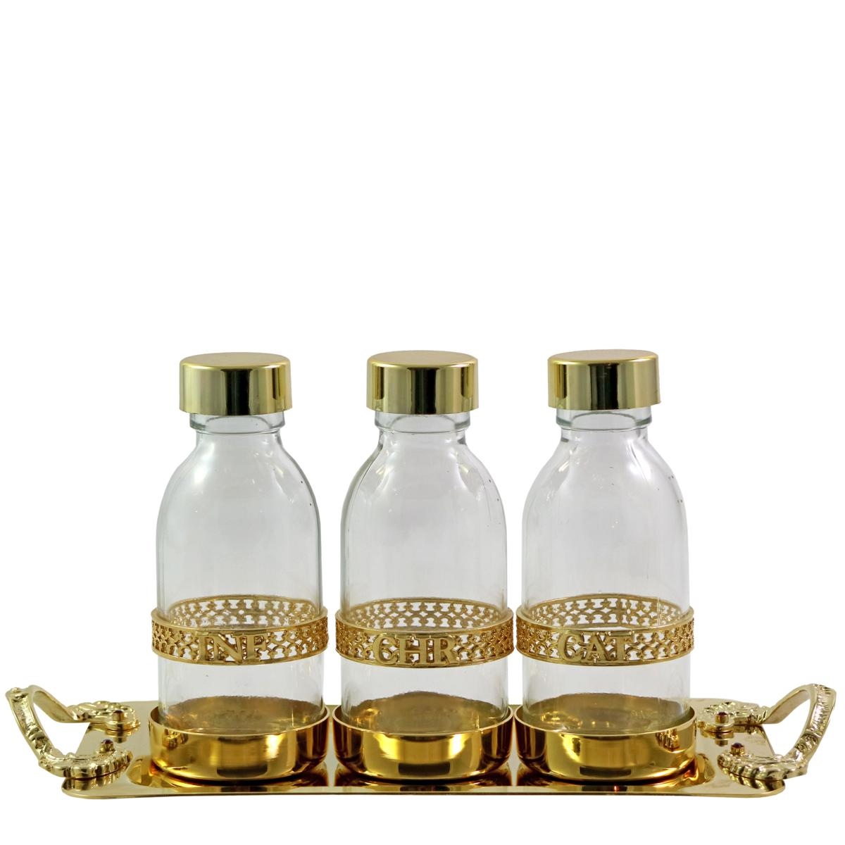 Servizio per oli Santi in ottone dorato, completo di tre vasetti in vetro per oli Santi con ghiera in fusione con decoro INF-CHRIS-CAT.