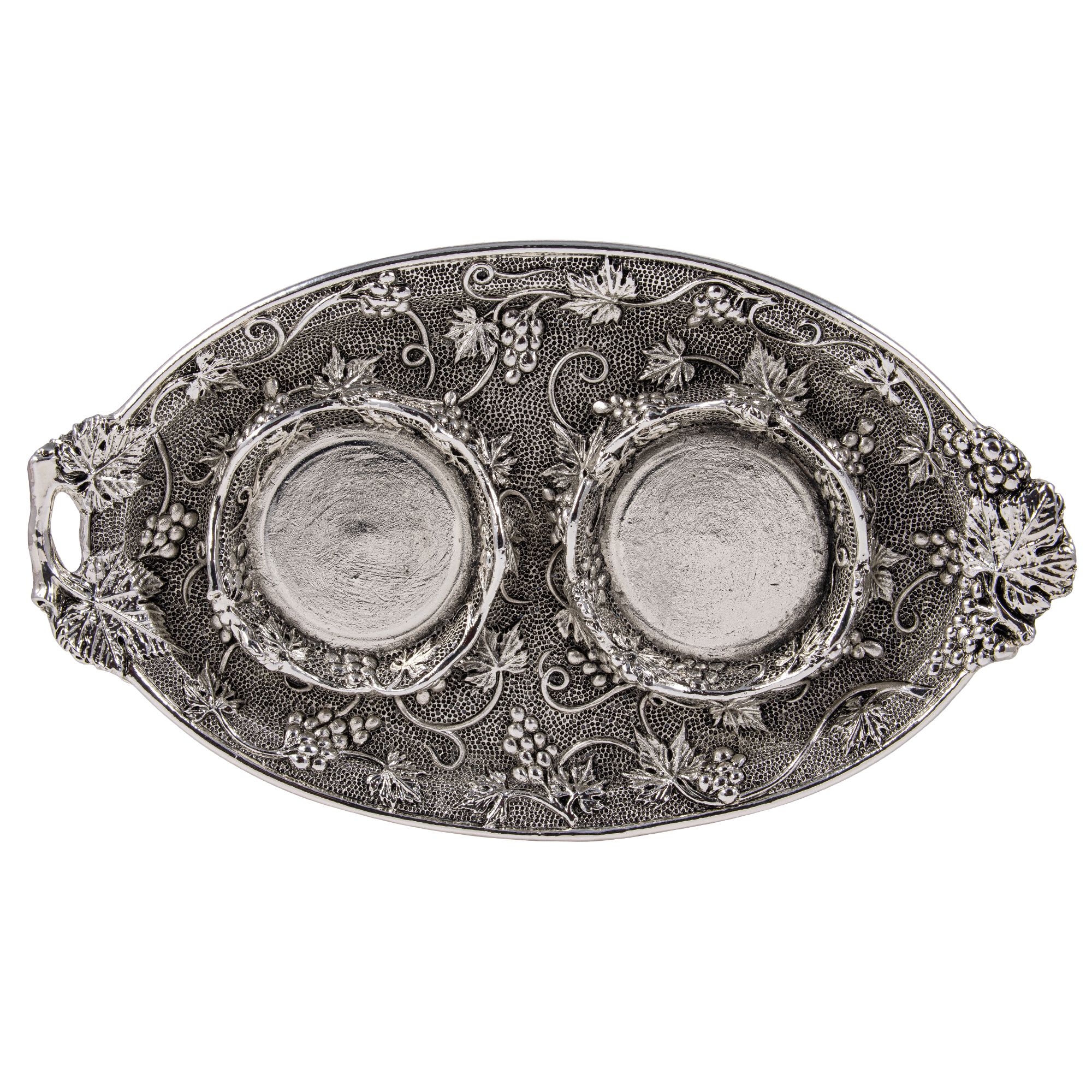 Servizio per Acqua e Vino in finitura argentata, con elegante piatto con motivo in rilievo."Uva e Foglie di Vite".