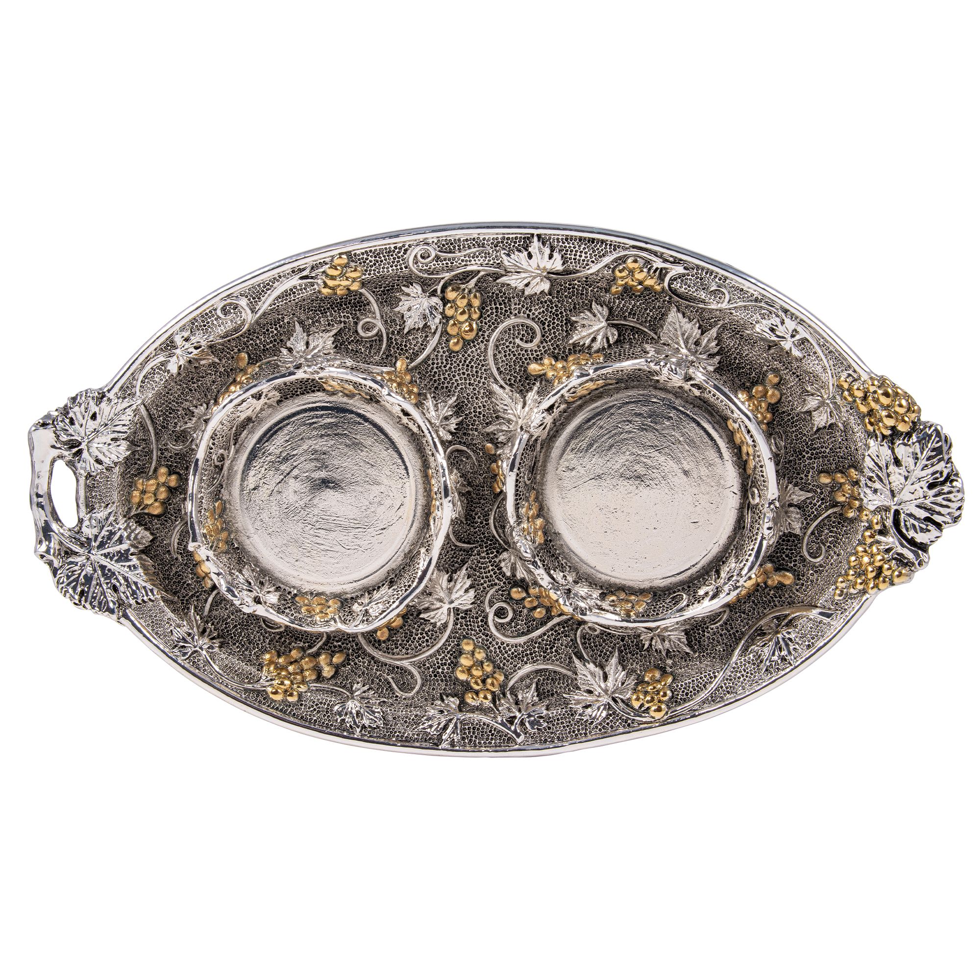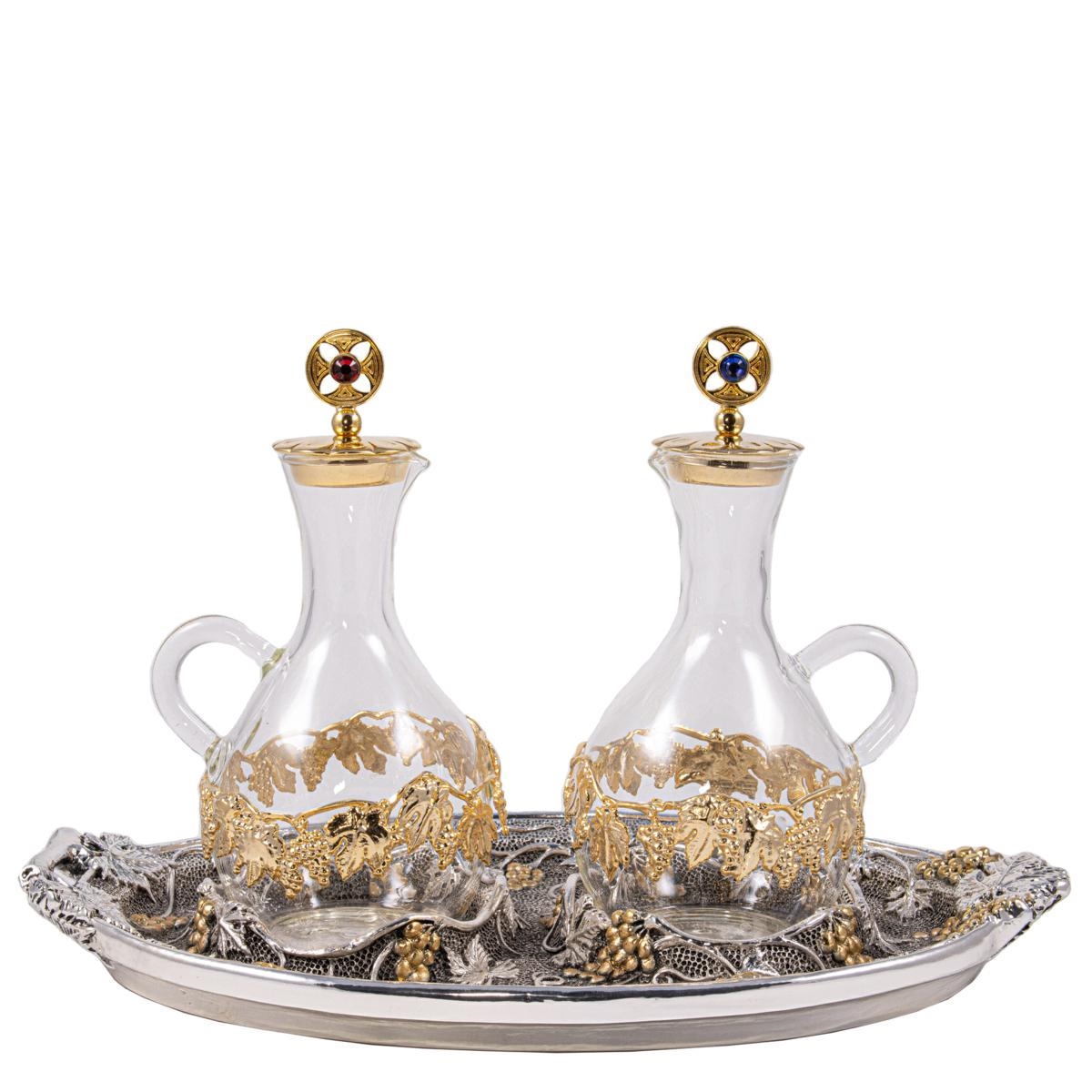 Servizio per Acqua e Vino in finitura dorata, con elegante piatto con motivo in rilievo."Uva e Foglie di Vite".
