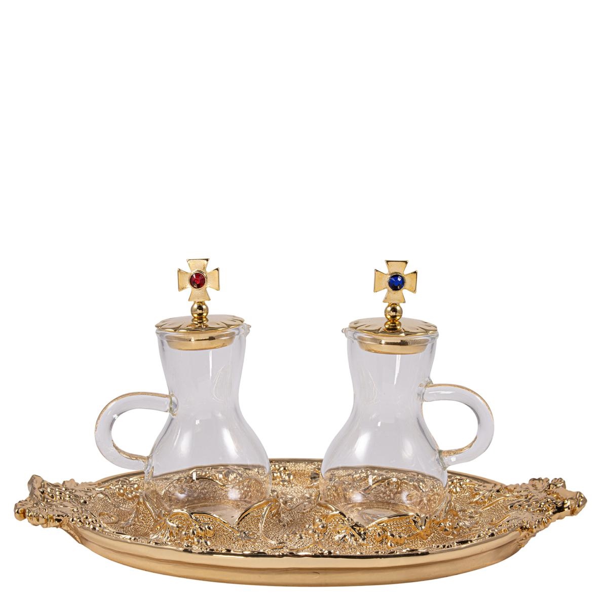 Tappi dorati con Croce tonda e pietra Rossa e Blu incastonate, per distinguere l' Acqua dal Vino.