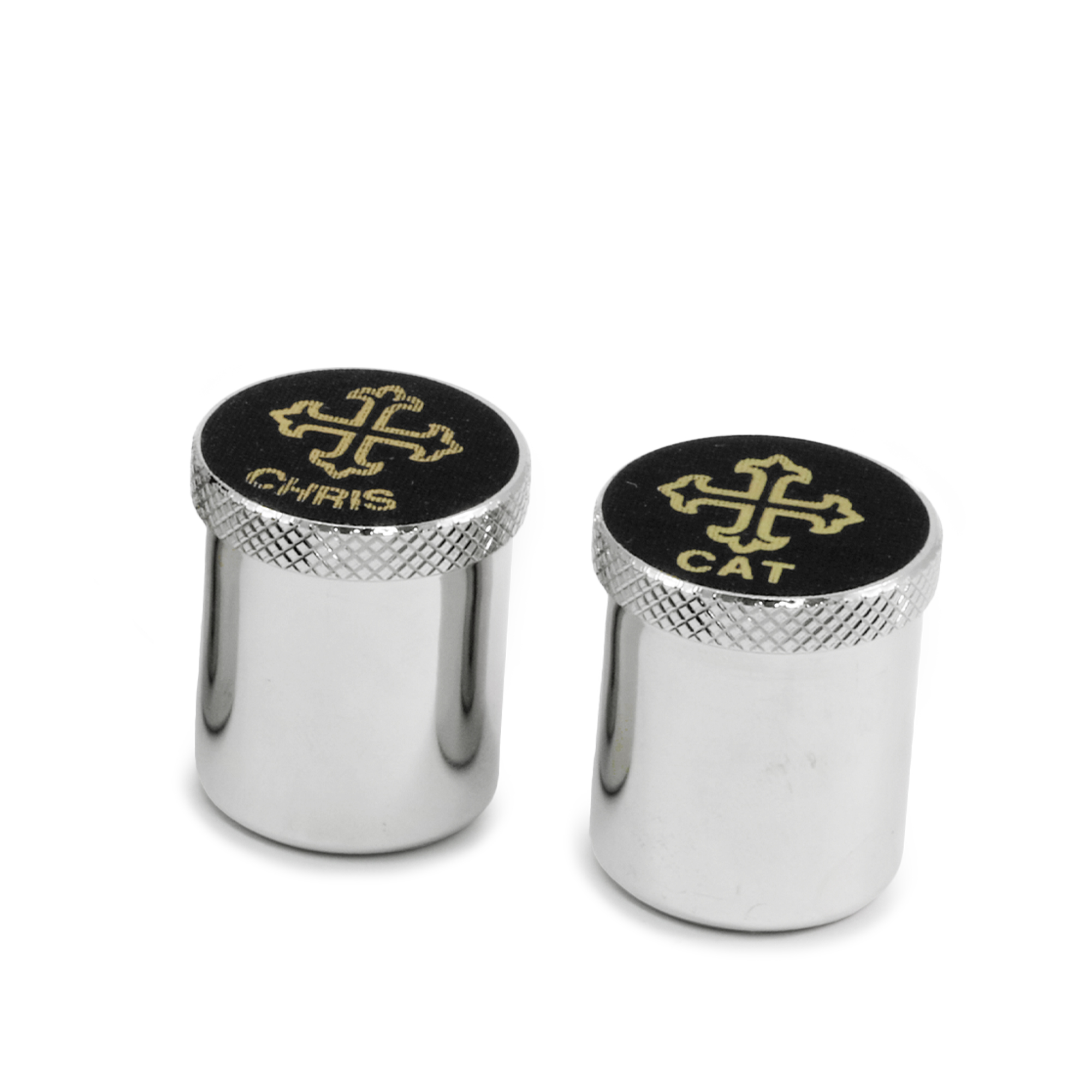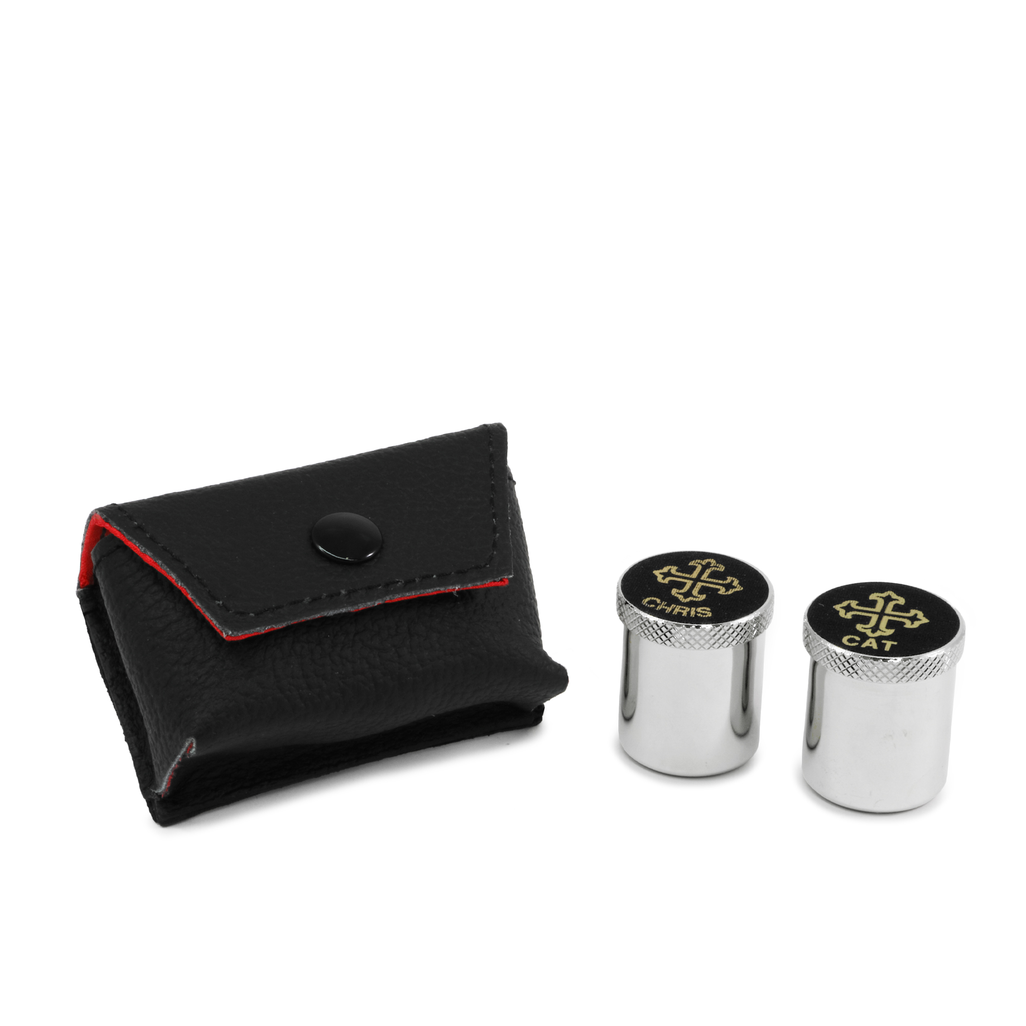 Astuccio in Vera Pelle nera, internamete foderato in Raso rosso e completo di due vasetti per Oli Santi in ottone tono argento, con incisione CHRIS-CAT sul coperchio.