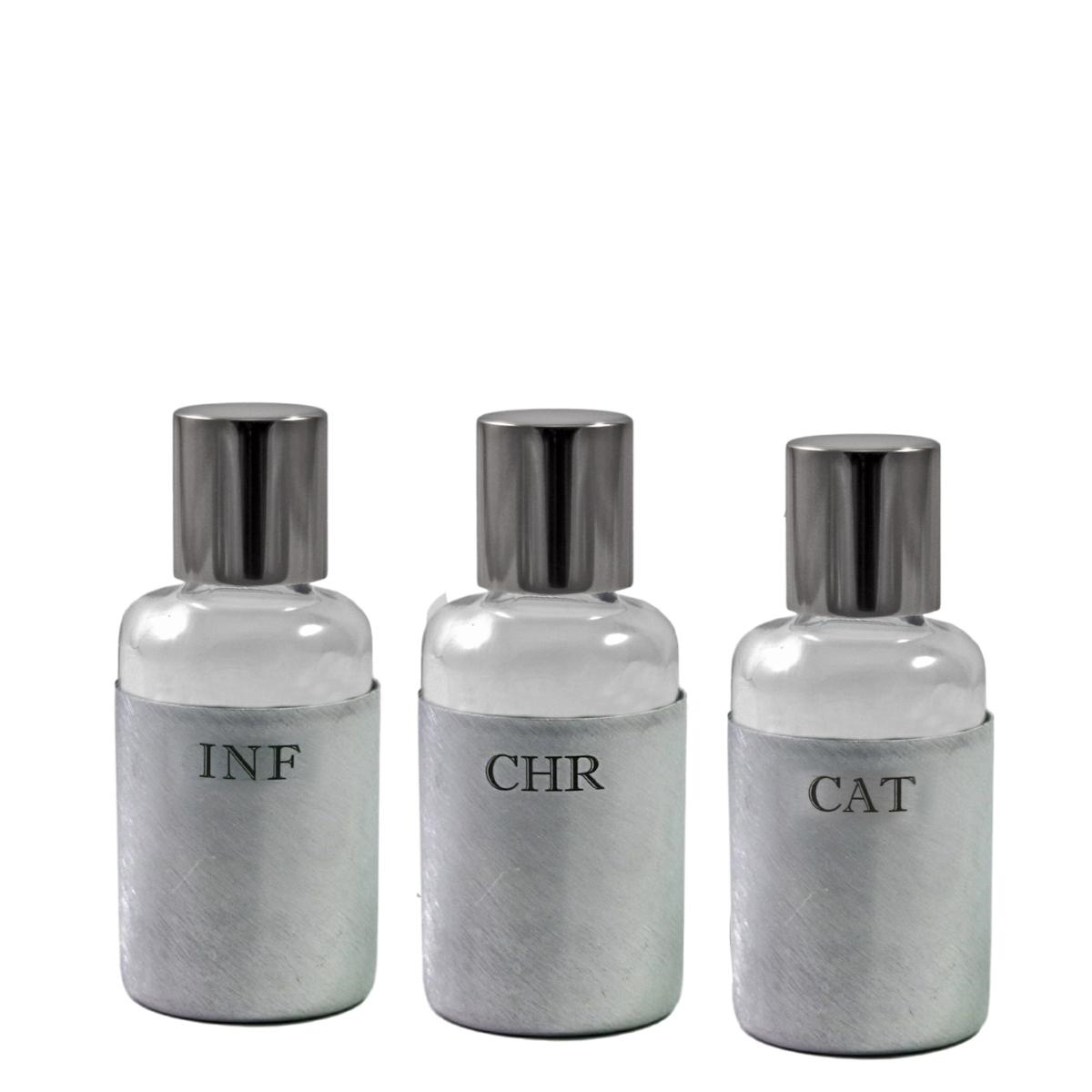 Set di 3 bottiglie in vetro per Oli Santi con corazza protettiva in alluminio e incisione INF CHR CAT.