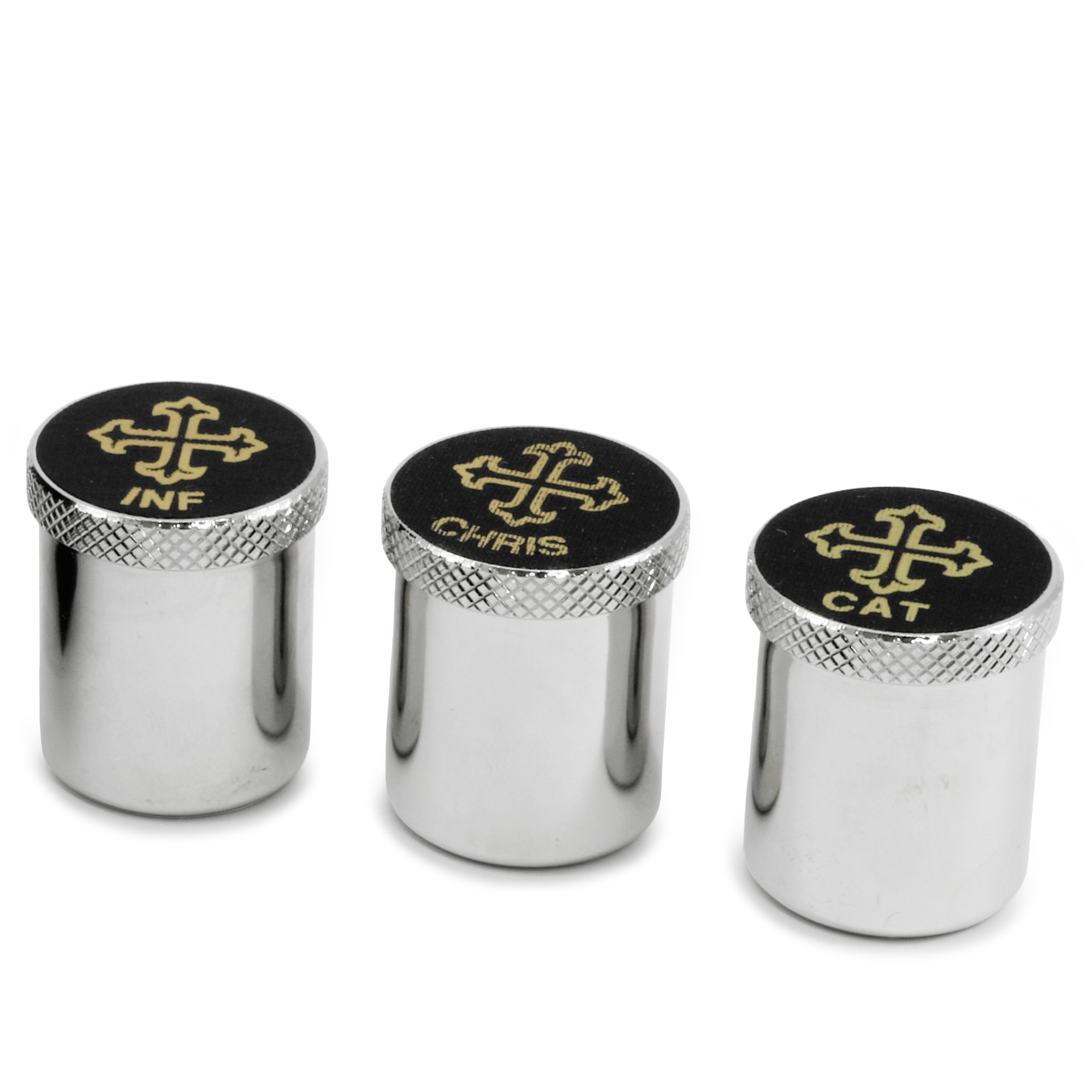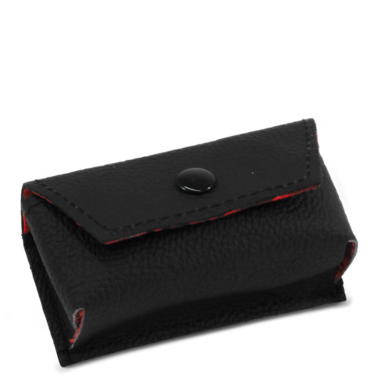 Astuccio in Vera Pelle nera, internamete foderato in Raso rosso e completo di tre vasetti per Oli Santi in ottone tono argento, con incisione INF-CHRIS-CAT sul coperchio.
