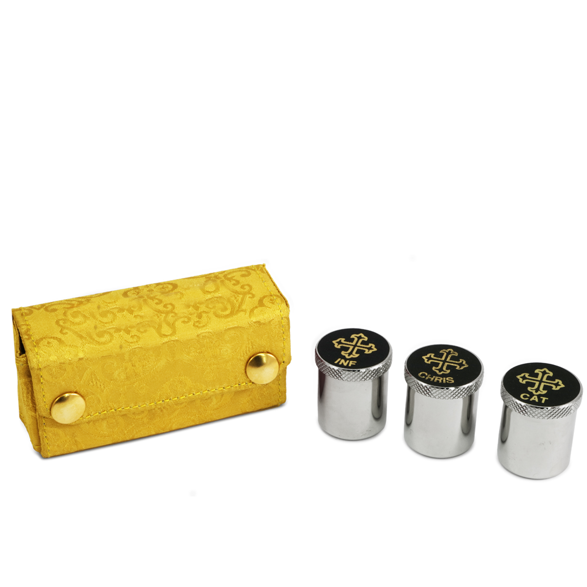 Astuccio in Raso giallo completo di tre vasetti per Oli Santi in ottone tono argento, con incisione INF-CHRIS-CAT sul coperchio.