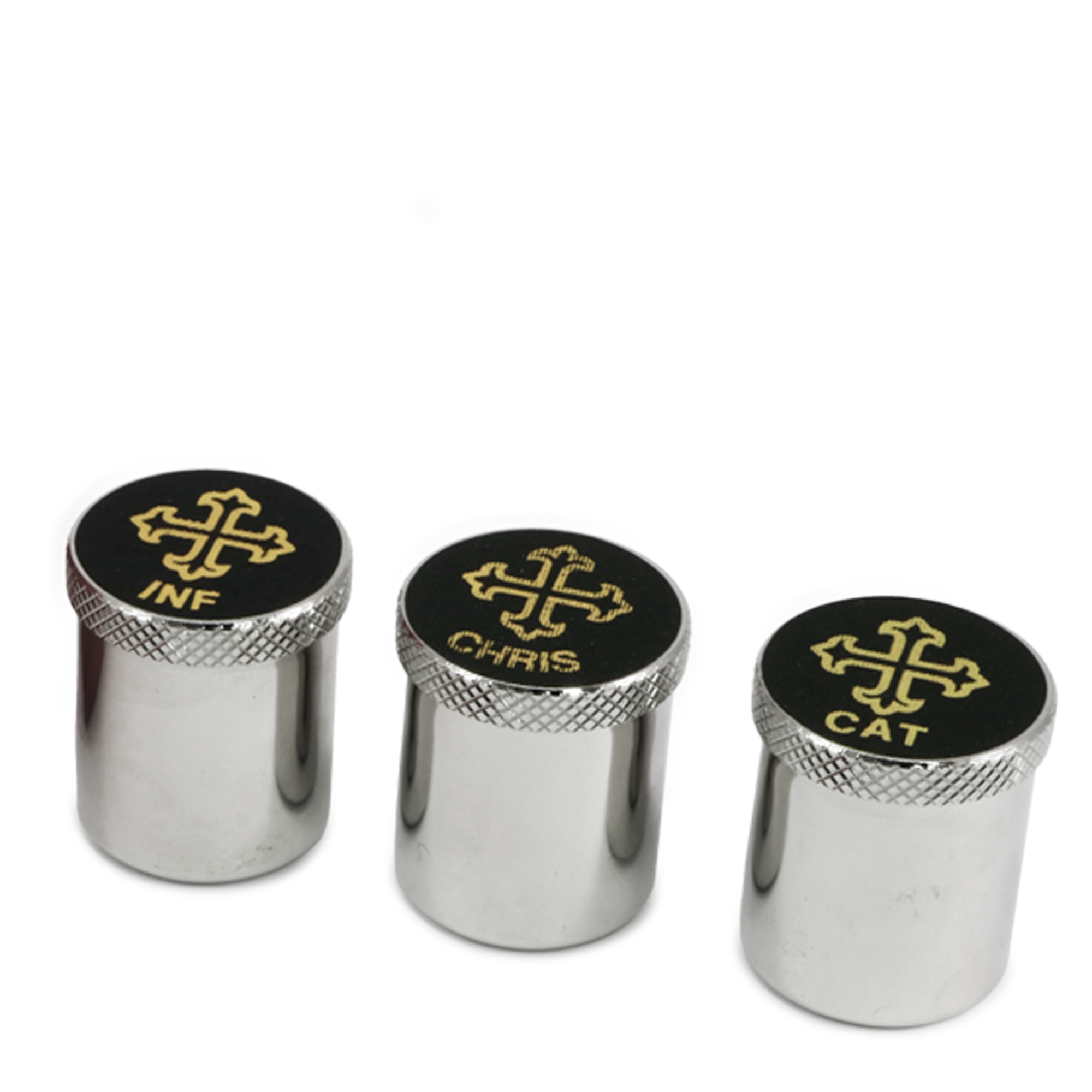 Astuccio in Raso rosso completo di tre vasetti per Oli Santi in ottone tono argento, con incisione INF-CHRIS-CAT sul coperchio.