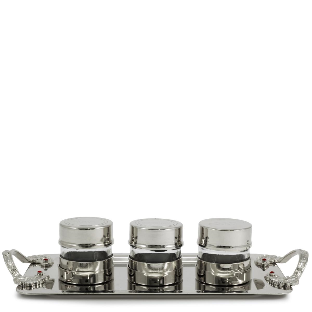 SET 3 VASETTI OLI SANTI CON VASSOIO TONO ARGENTO