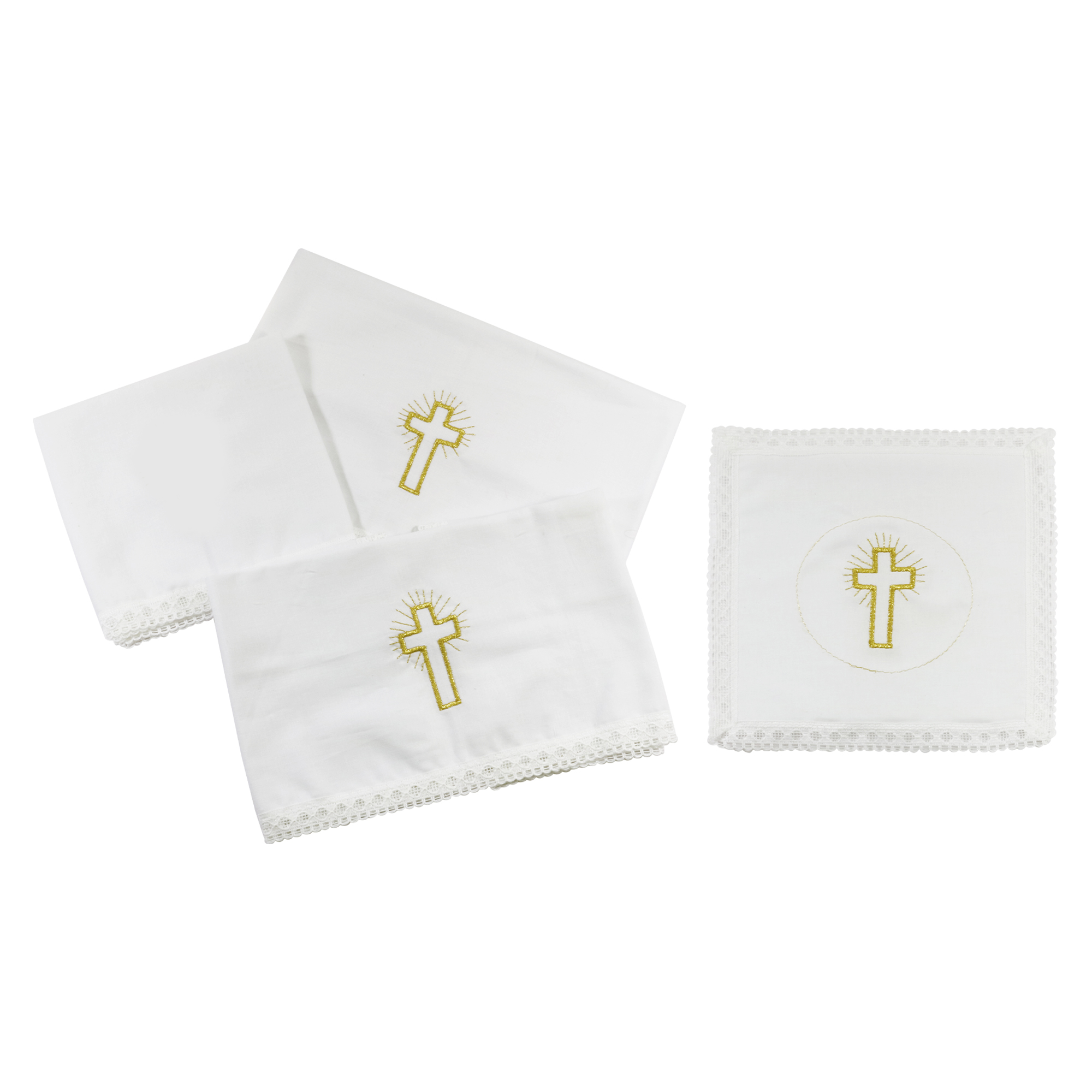 Set Messa 100% cotone con Croce ricamata a filo dorato.