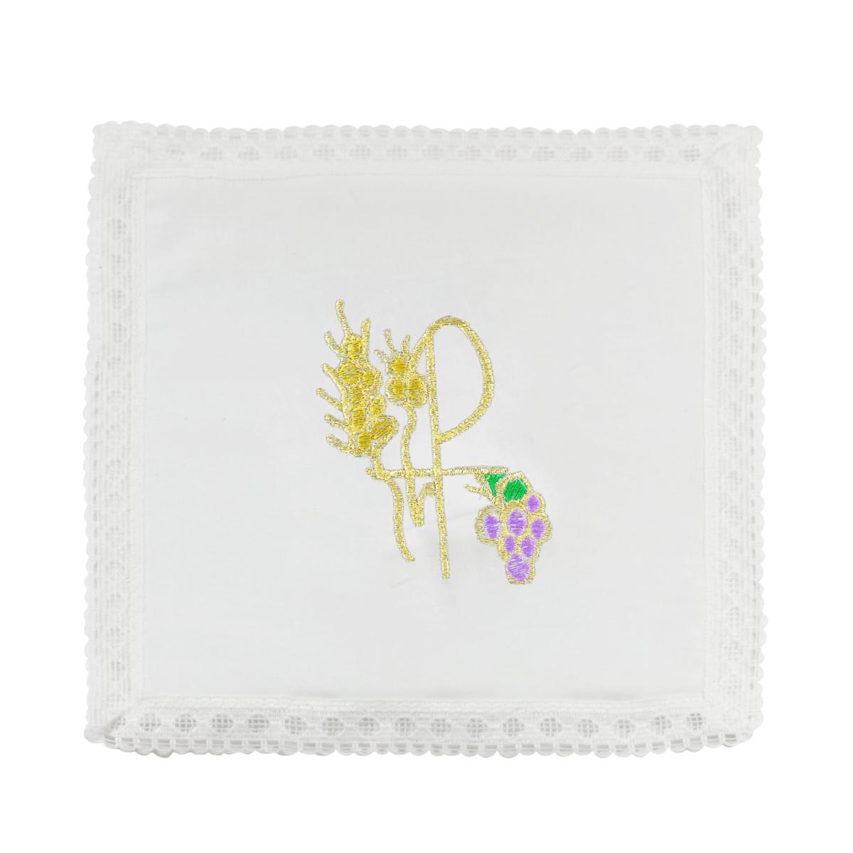 -Corporale 100% Cotone 45 x 45 cm. con ricamo Px decorato con Uva e Spighe di grano a filo dorato.