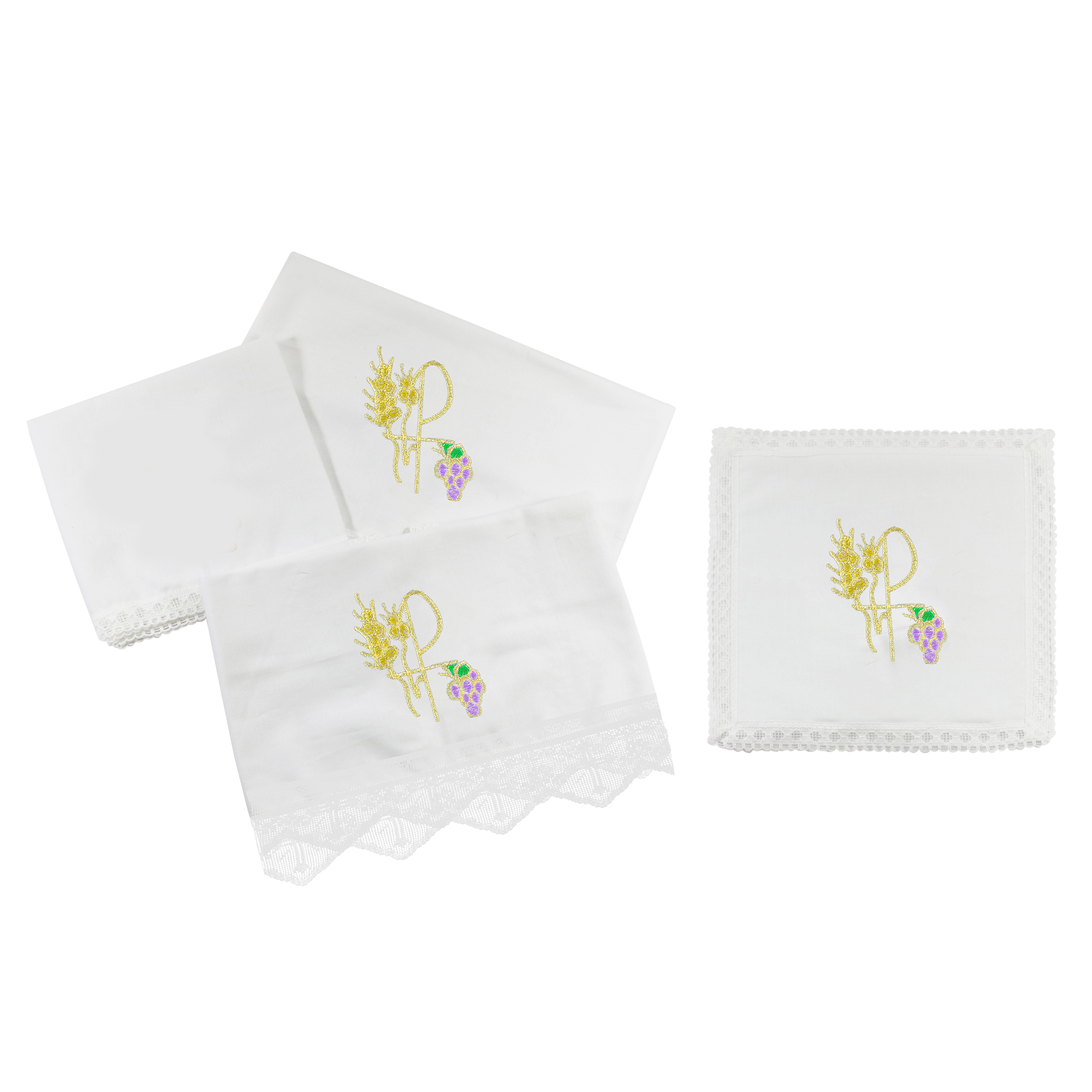 Set Messa 100% cotone con ricamo Px decorato con Uva e Spighe di grano a filo dorato.