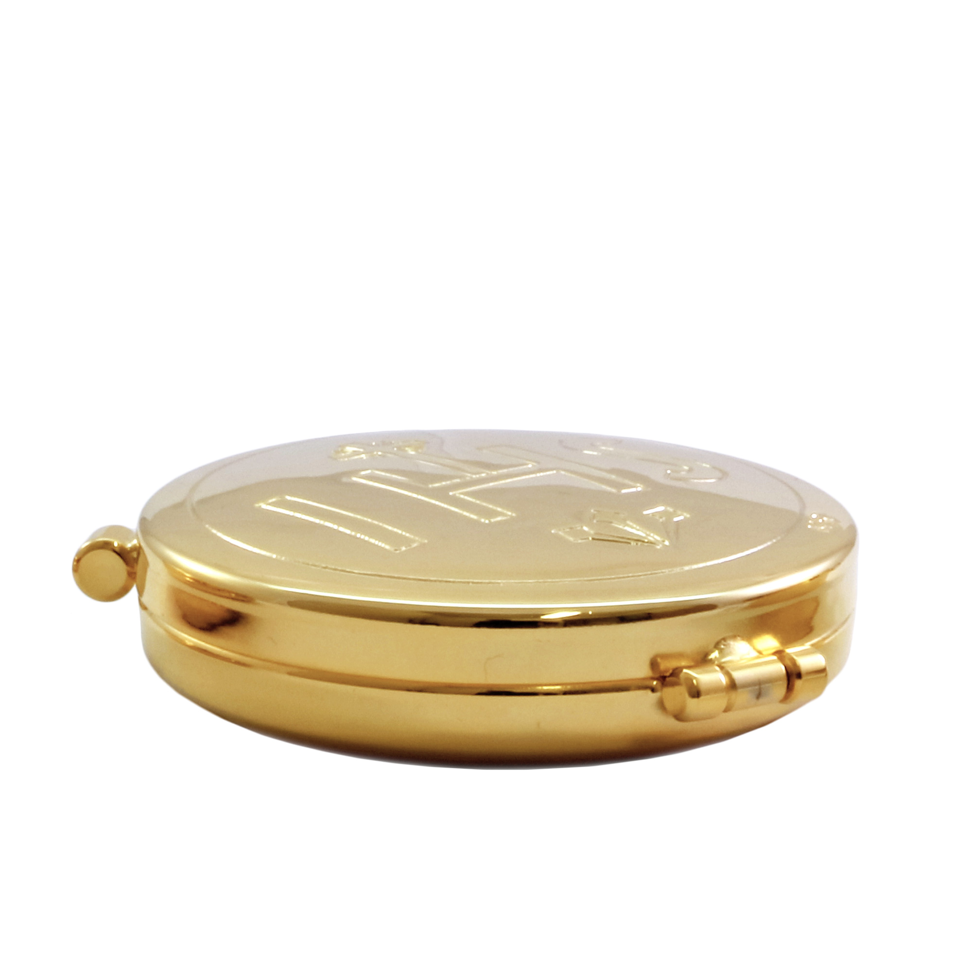 Eucharistic pyx in gold-plated brass with the IHS symbol. It features a ring for carrying it around the neck and a practical latch for easy opening.