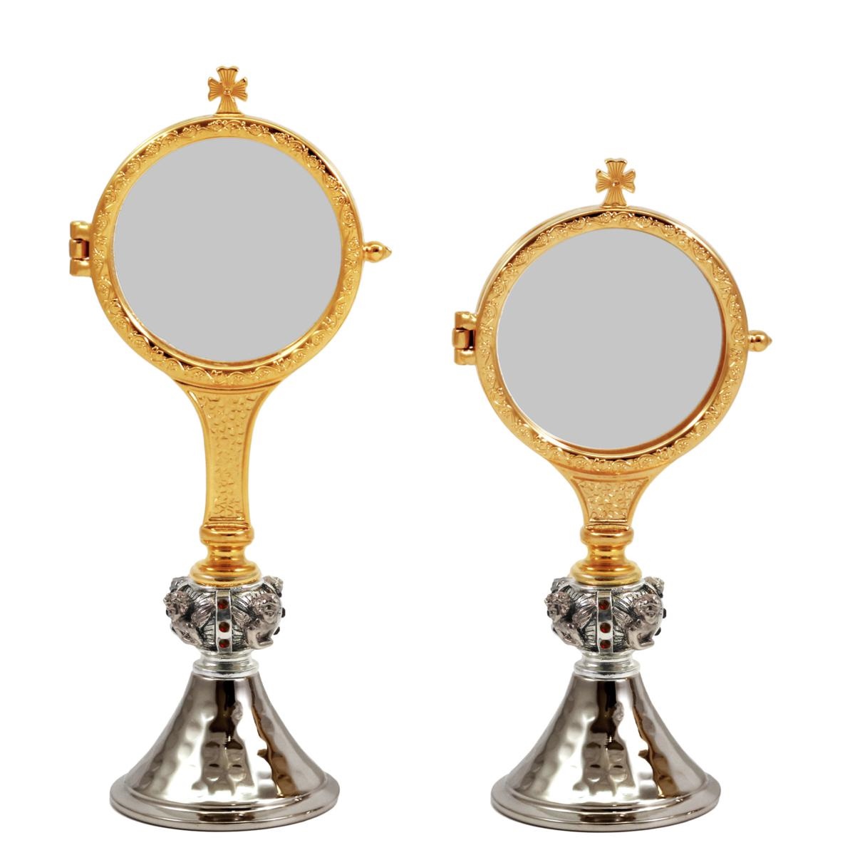 Teca per esposizione dell' Ostia magna in fusione dorata su base martellata tono argento, con nodo decorato con angeli e pietre rosse, in finitura argento antico.