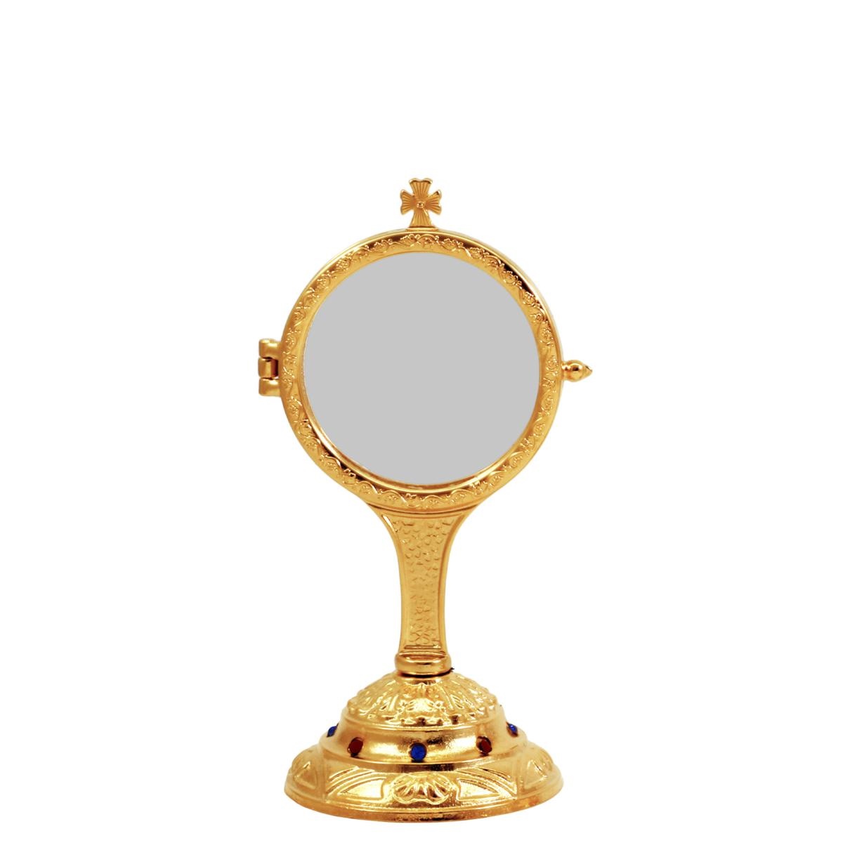 Chapel Monstrance for the 8 cm. host in gold plated brass metal on a base decorated with red and blue stones.