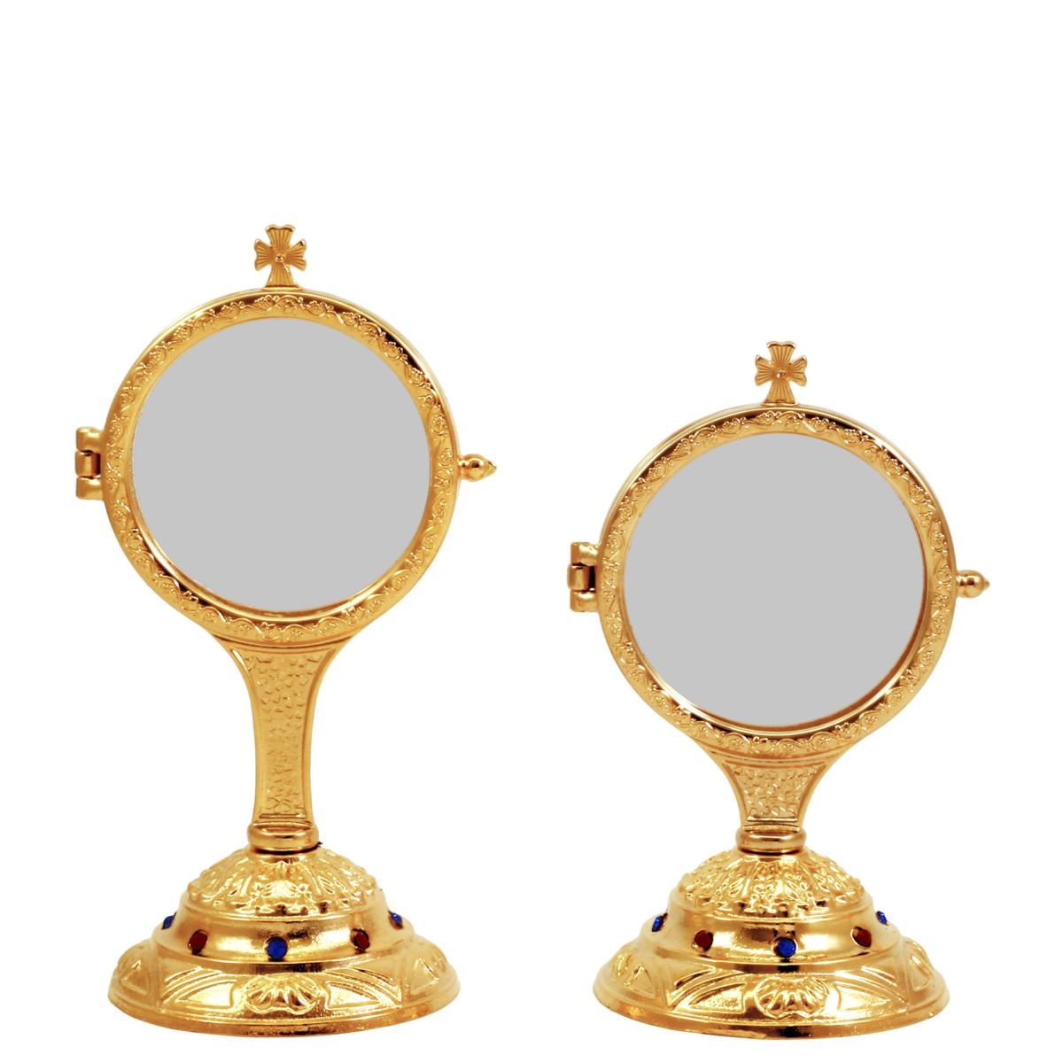 Teca per esposizione dell' Ostia magna in fusione dorata su base decorata con pietre rosse e blu.