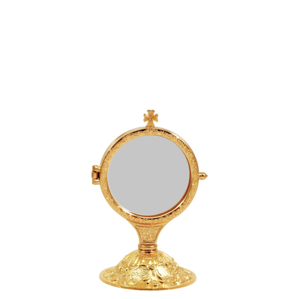 Chapel Monstrance for the 8 cm. host in gold plated brass metal on a baroque base with a gold finish.