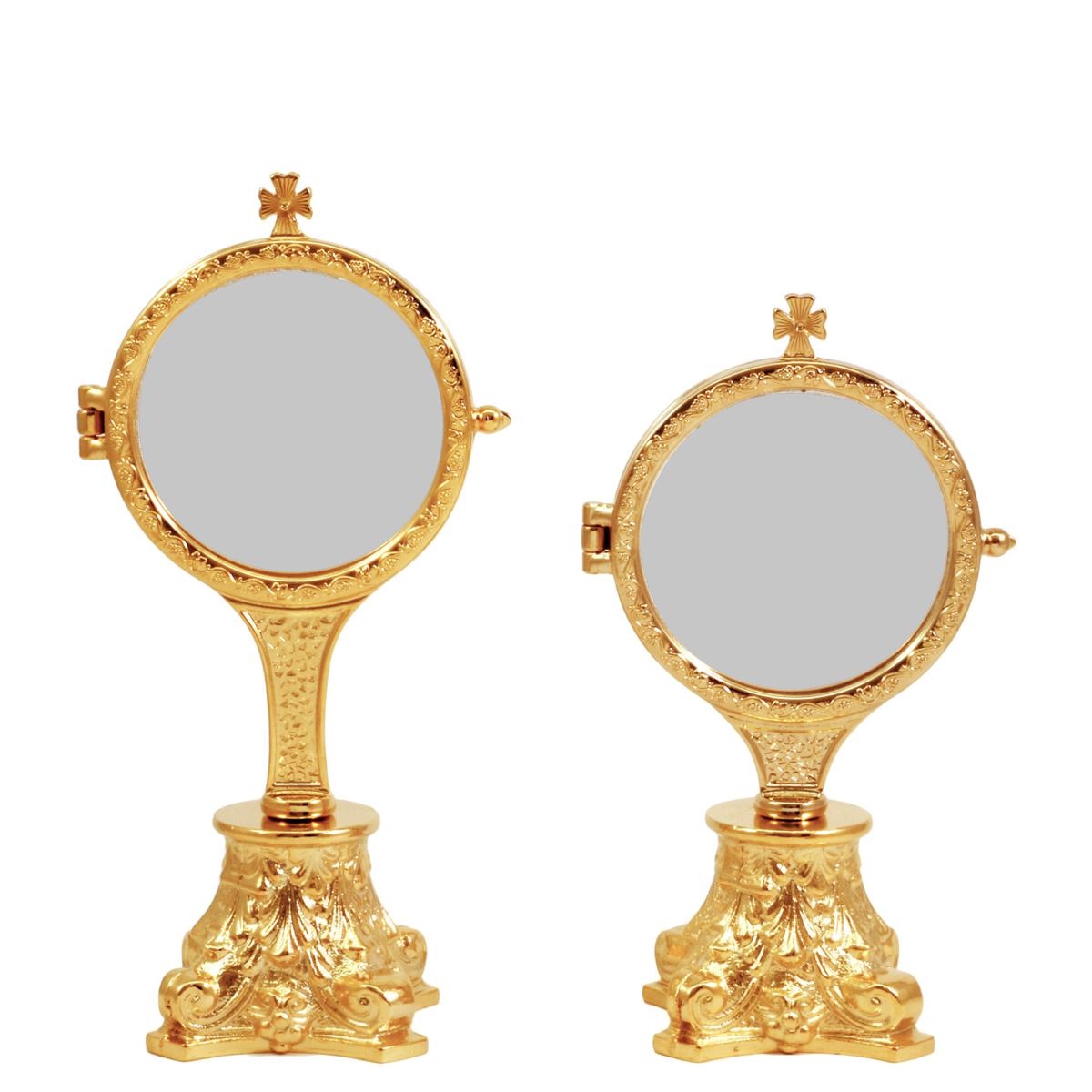 Teca per esposizione dell' Ostia magna in fusione dorata su base barocca in finitura ottone lucido.