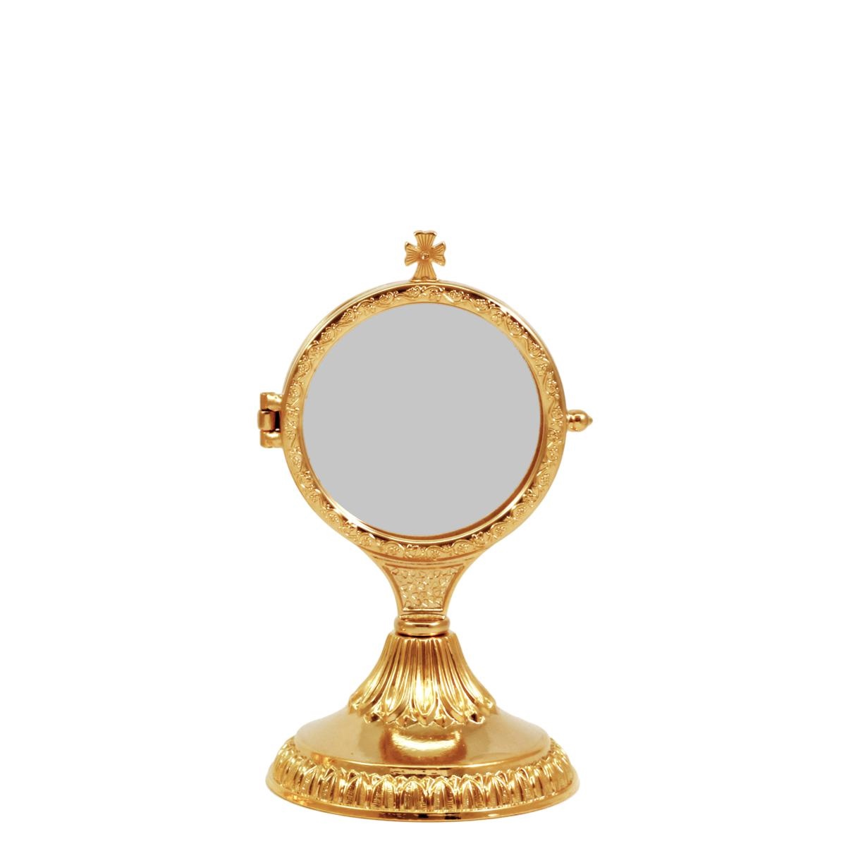 Teca per esposizione dell' Ostia magna in fusione dorata su base lavorata. La base è in finitura dorata.