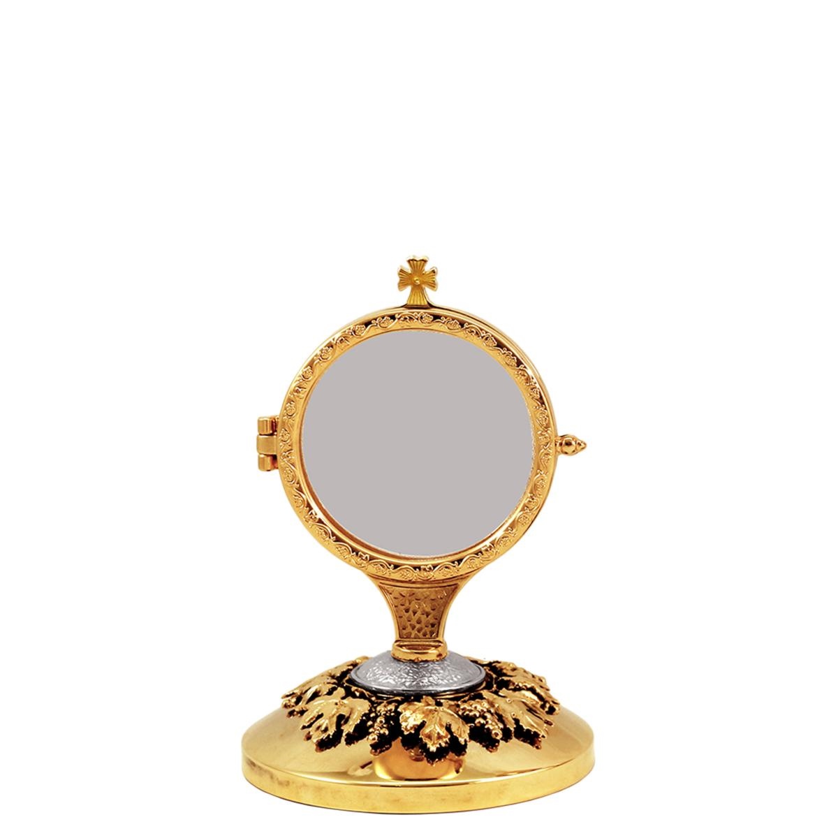 Teca per esposizione dell' Ostia magna in fusione dorata su base decorata con Uva e foglie di Vite in finitura ottone anticato. La base è in finitura dorata.