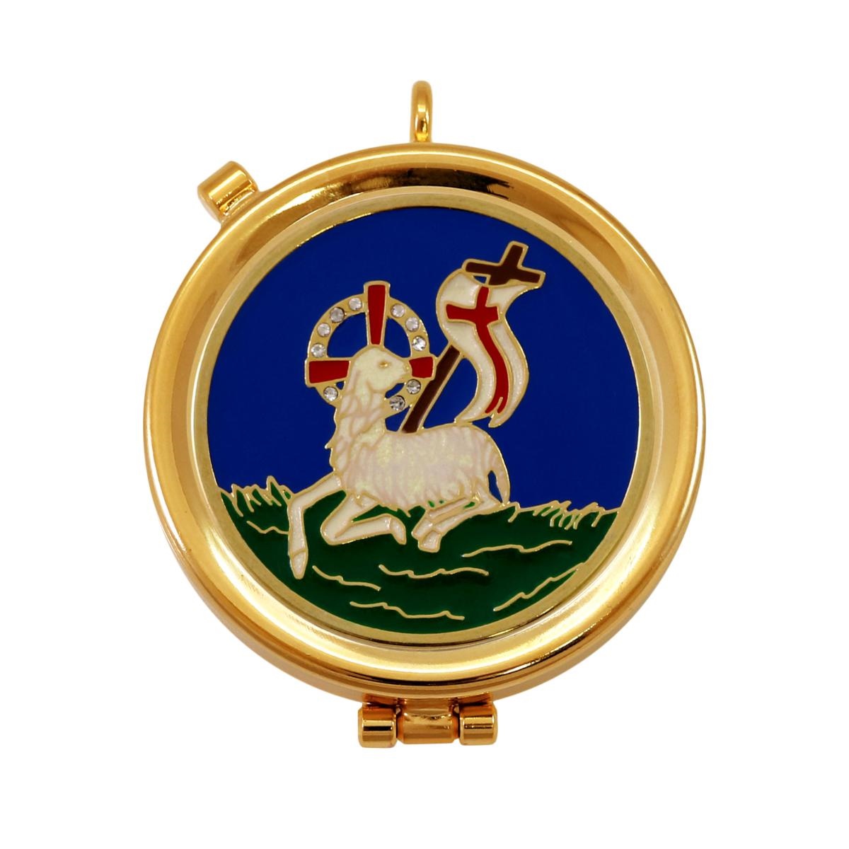 Eucharistic pyx in gold plated brass with a decorative hand-enamelled plaque depicting the Lamb of Peace with brilliant stones. It features a ring for carrying it around the neck and a practical latch for easy opening. The pyx has a diameter of 5.3 cm and holds approximately 12 hosts.
