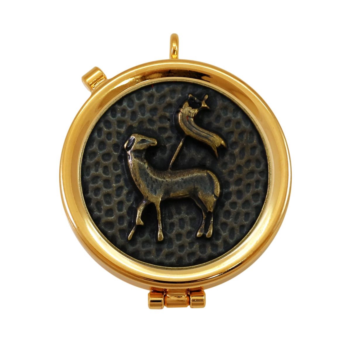 Teca Eucaristica in ottone dorato con placca decorativa in finitura bronzo antico con martellatura, raffigurante l'immagine in rilievo dell' Agnello della pace.