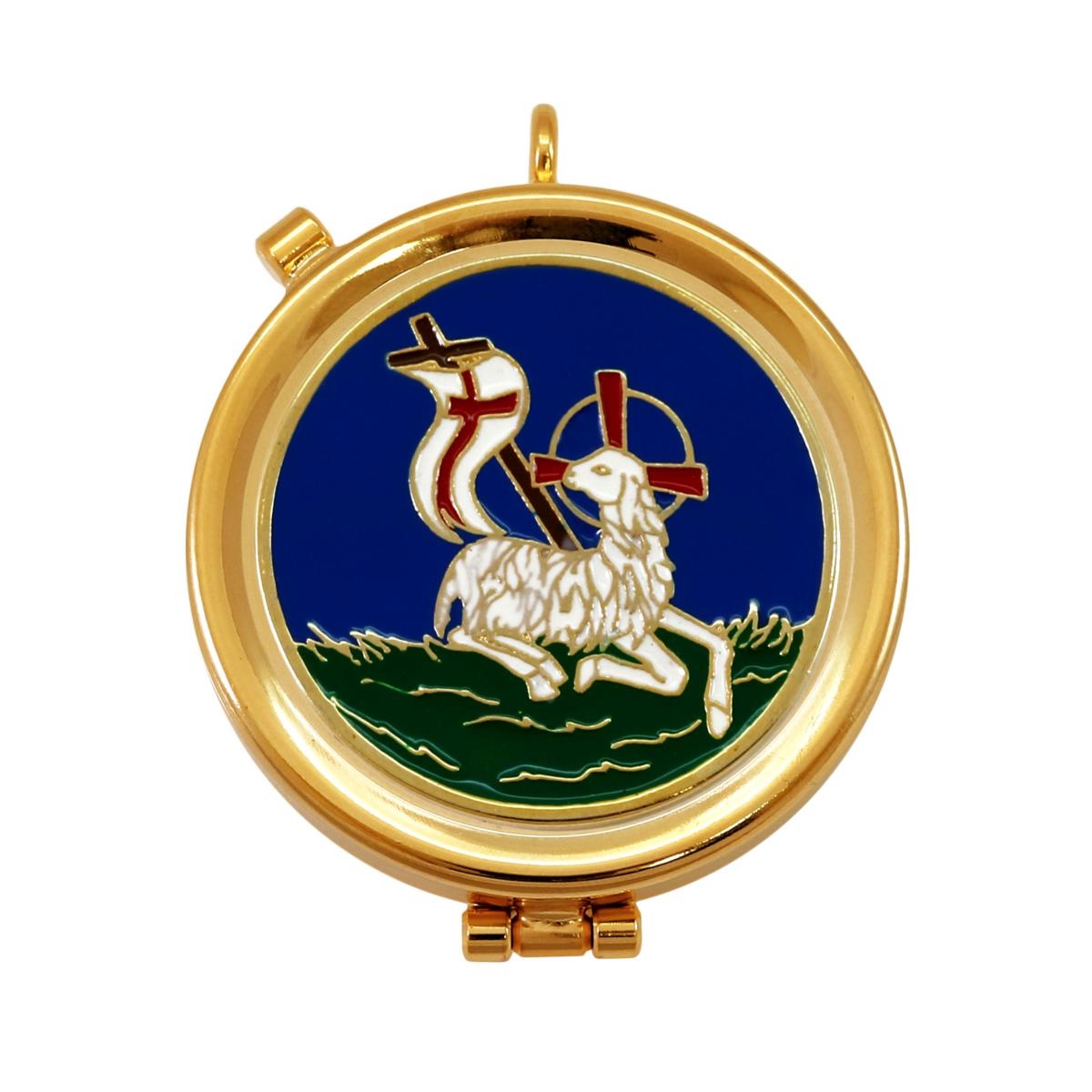 Teca Eucaristica in ottone dorato con placca decorativa smaltata a mano, raffigurante l' Agnello della Pace.