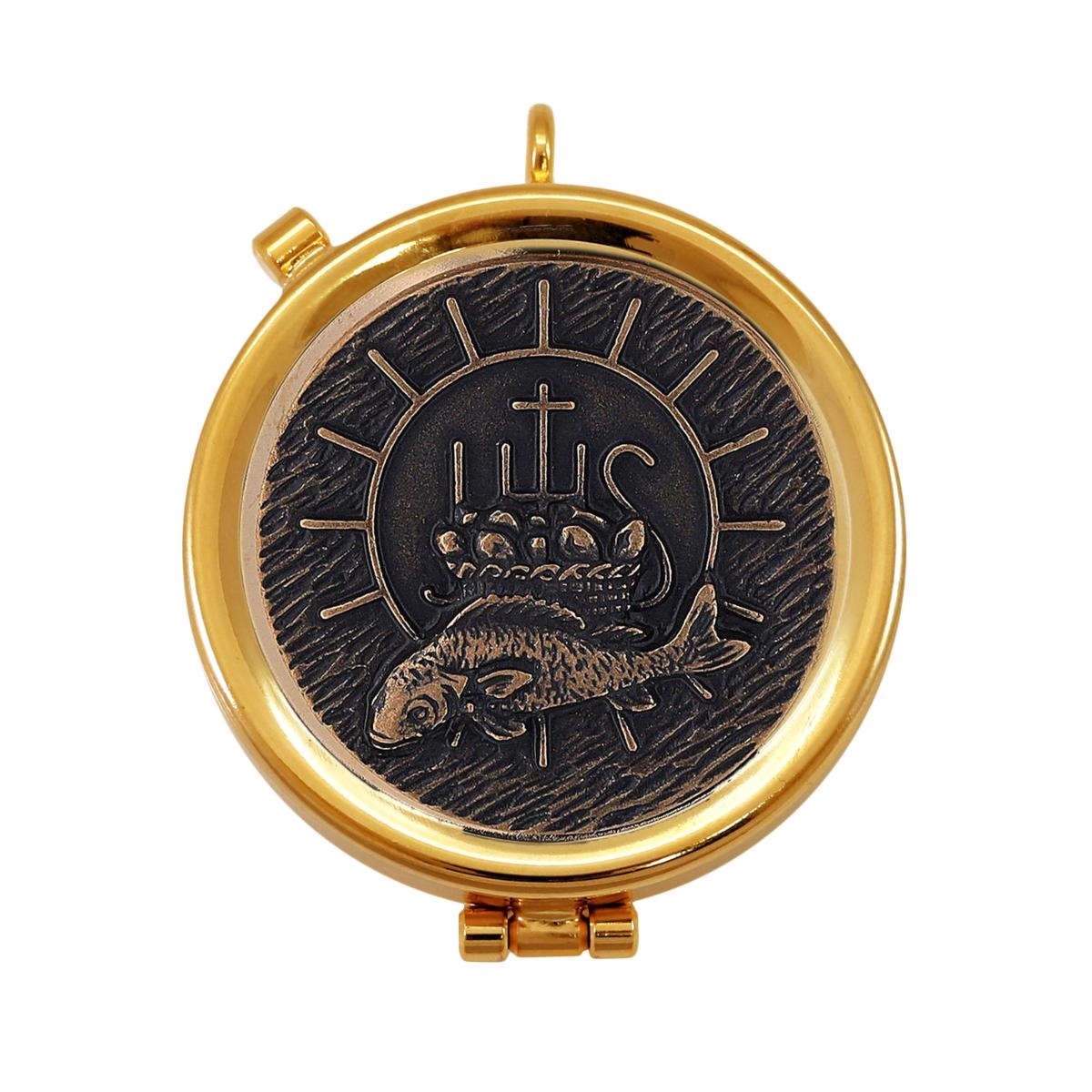 Eucharistic pyx in gold plated brass with a decorative plaque in an antique bronze finish, depicting a fish with a basket of bread and the IHS symbol in the background. It features a ring for carrying it around the neck and a practical latch for easy opening. The pyx has a diameter of 5.3 cm and holds approximately 12 hosts.