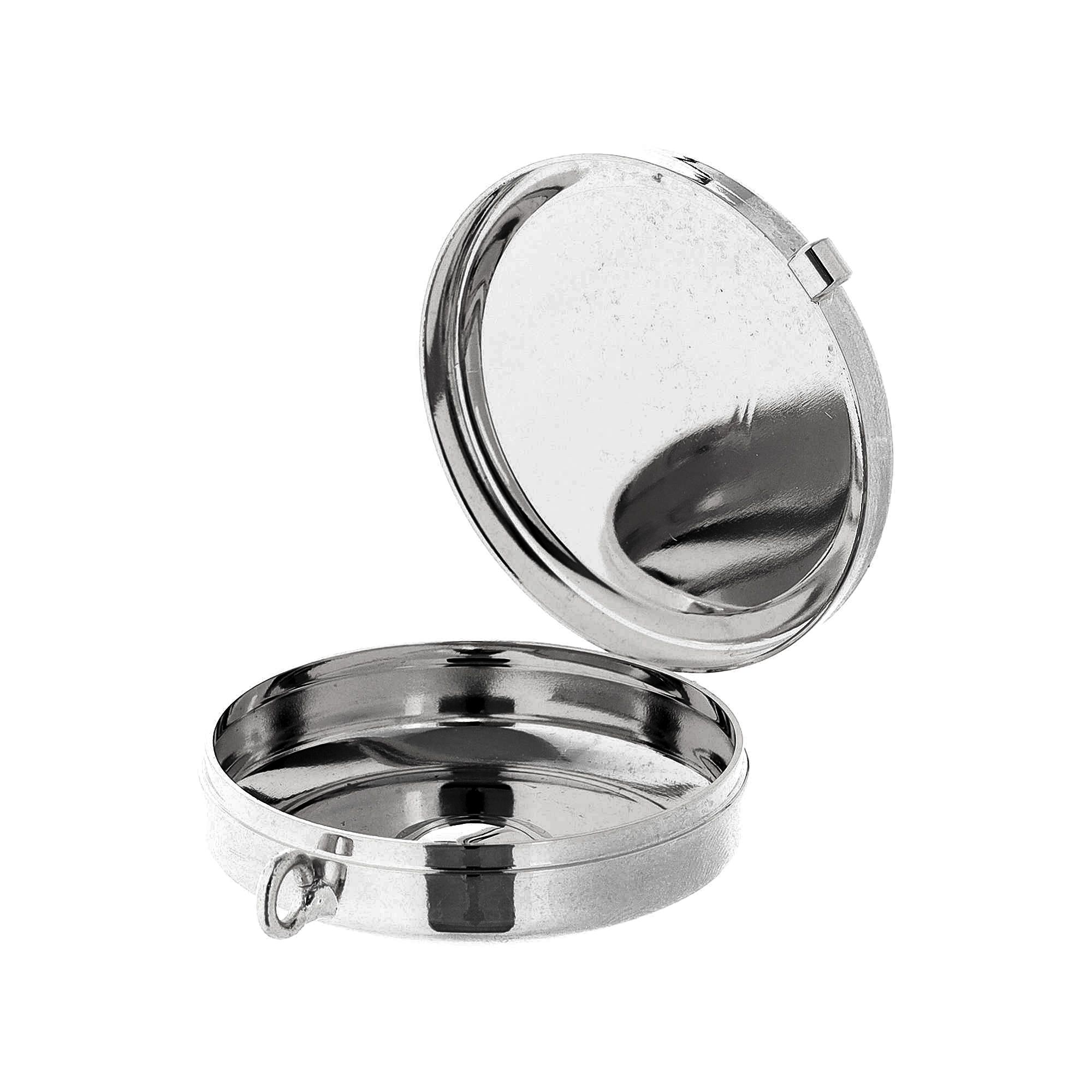 La teca ha un diametro di 5,3 cm. e un altezza di 1,8 cm. e contiene circa 12 particole.