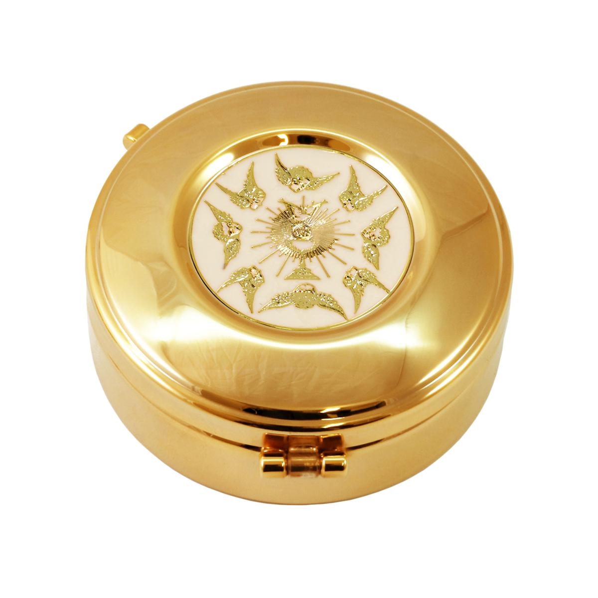 Teca porta ostie in ottone dorato con placca decorativa in rilievo, raffigurante degli Angioletti e un Ostensorio dorati.