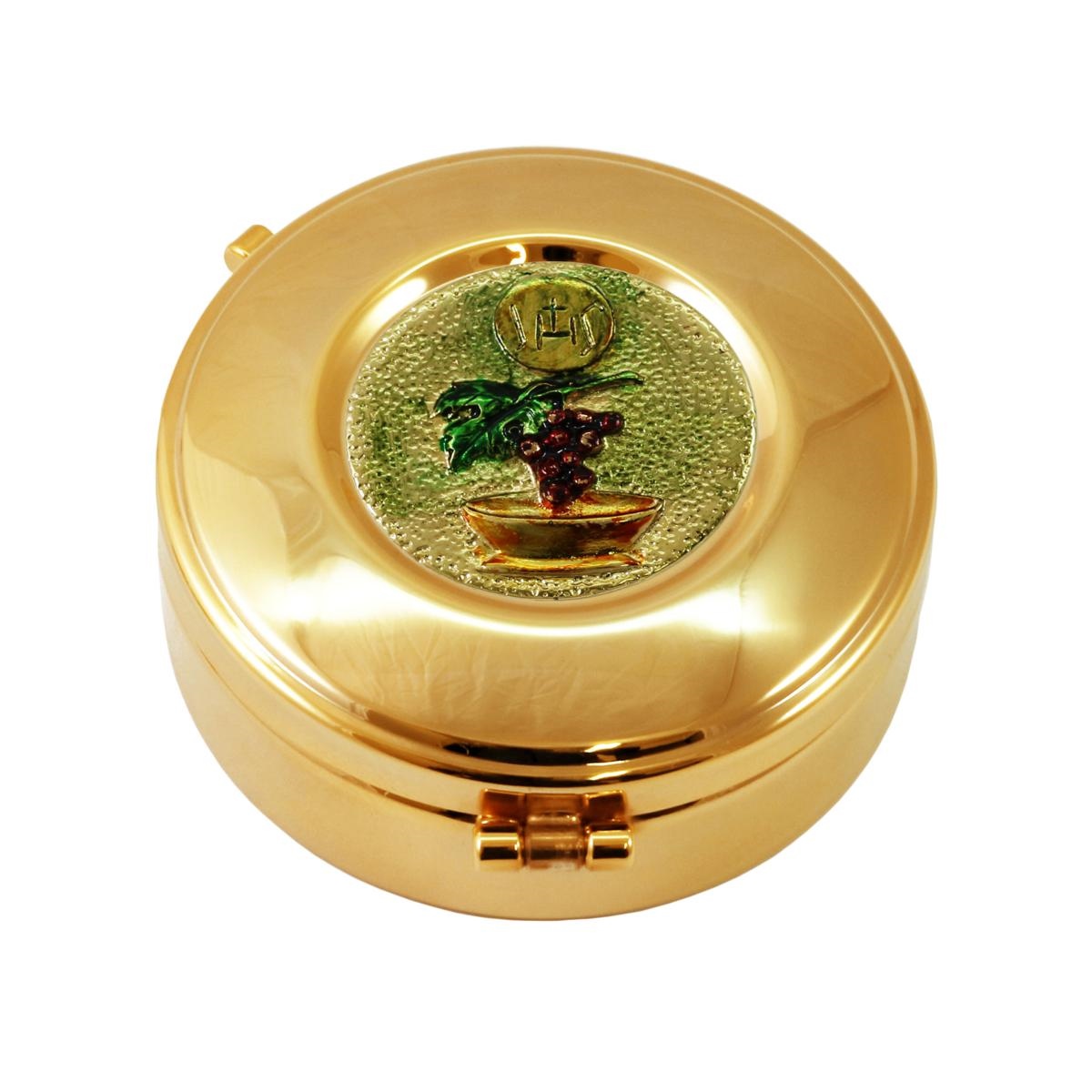 Teca porta ostie in ottone dorato con placca decorativa in rilievo, raffigurante un cesto con Uva e il simbolo IHS in finitura argentata e dipinti a mano.