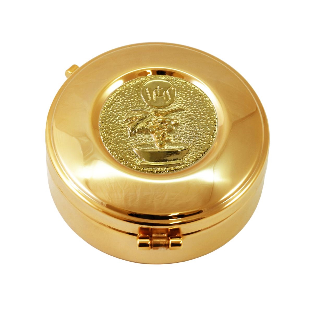 Host box in gold plated brass with a decorative plaque in relief, depicting a basket with grapes and the IHS symbol. TheHost box is available in the following sizes: - Ø 8.4 cm. x height 2.5 cm. - Ø 9.2 cm. x height 2.5 cm.