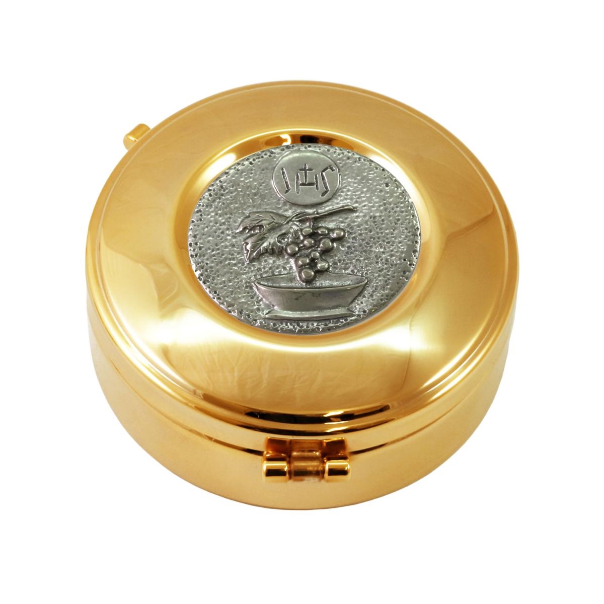 Teca porta ostie in ottone dorato con placca decorativa in rilievo, raffigurante un cesto con Uva e il simbolo IHS.