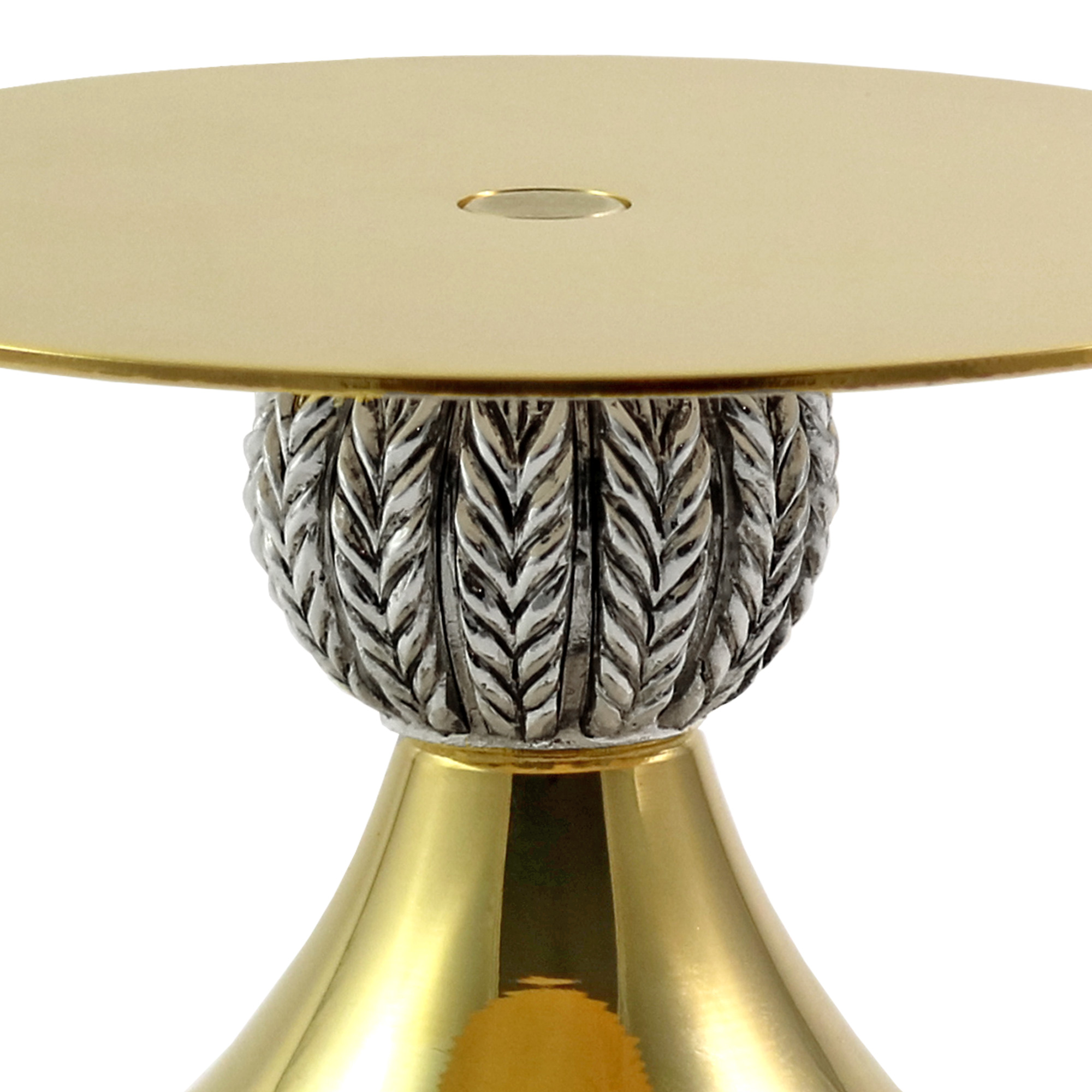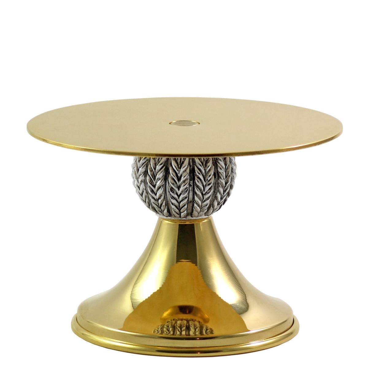 Tronetto per teca da esposizione con base e piatto in ottone dorato ed elegante nodo in finitura argentata, raffigurante delle spighe di grano.