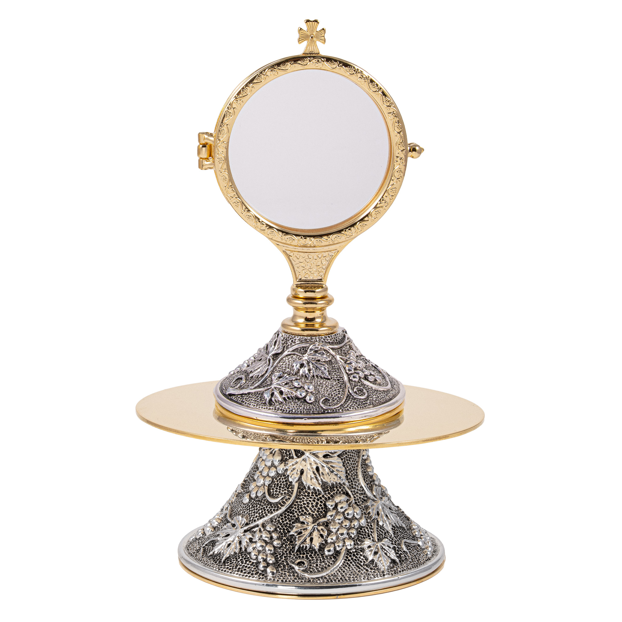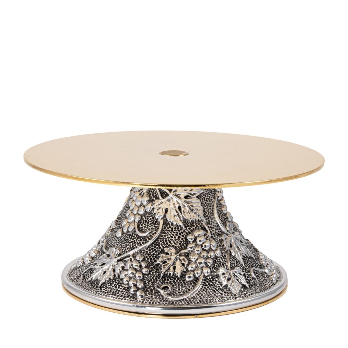 Tronetto per teca da esposizione con piatto in ottone dorato ed elegante base con decoro uve e foglie di vite in finitura argento antico.