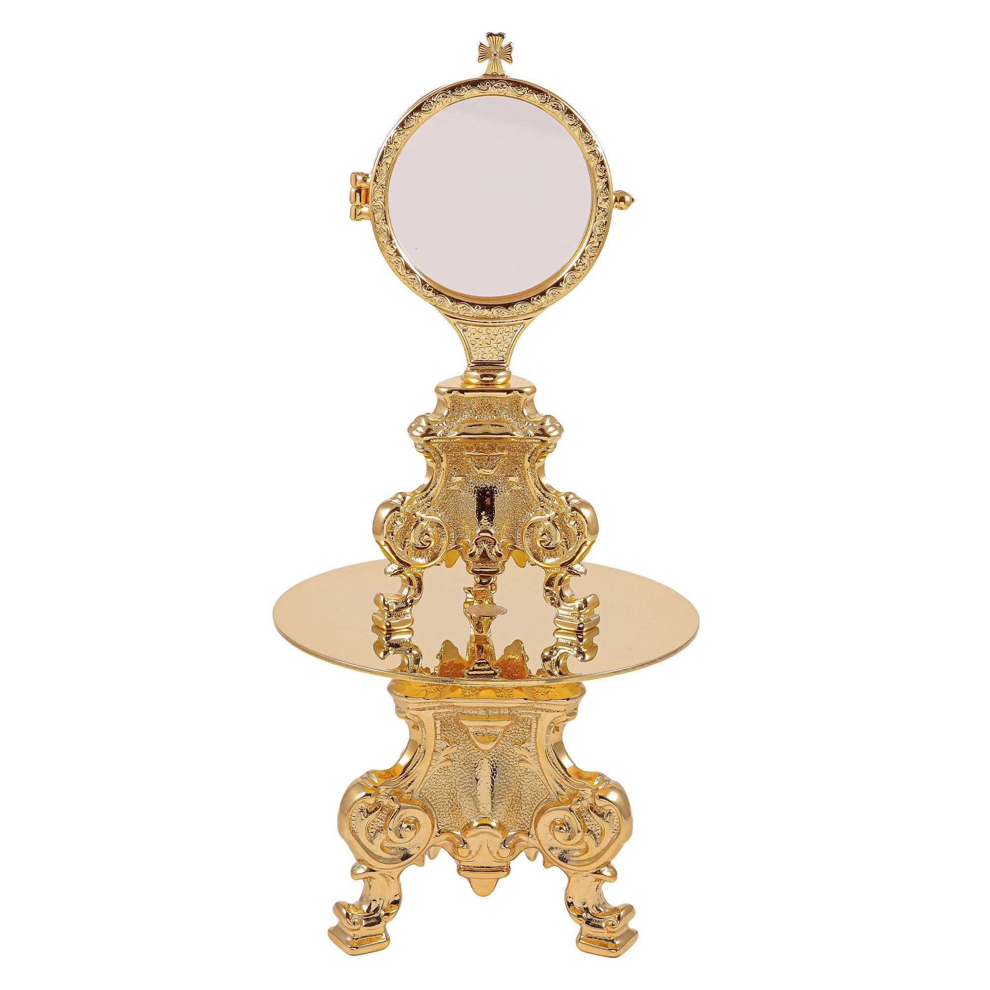 Tronetto per teca da esposizione con base Rococò e piatto in ottone dorato .