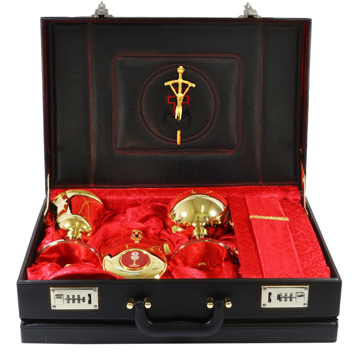 Valigia 24 ore in ecopelle con chiusura a combinazione. E' foderata internamente in Raso rosso e completa di tutto il necessario per la Celebrazione.