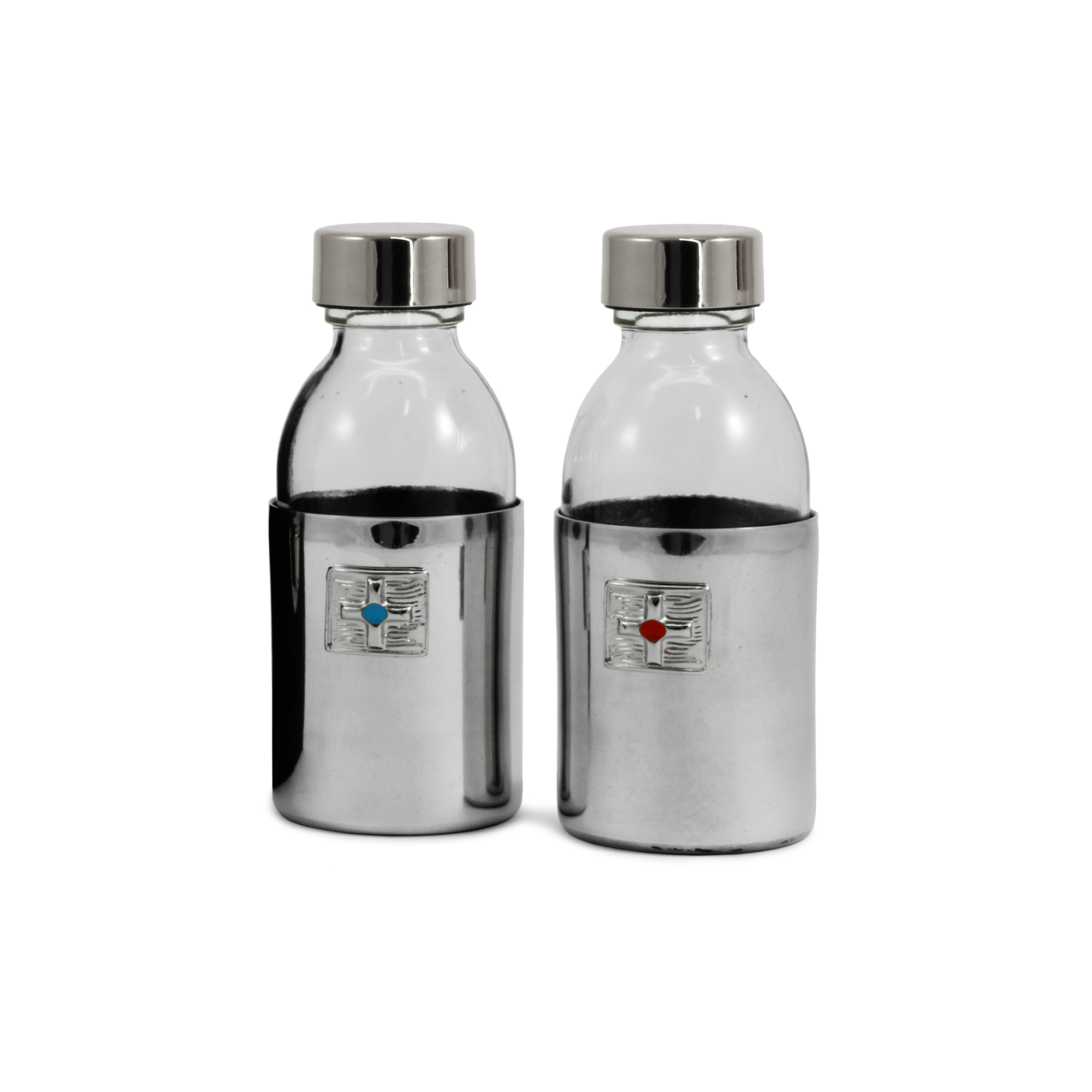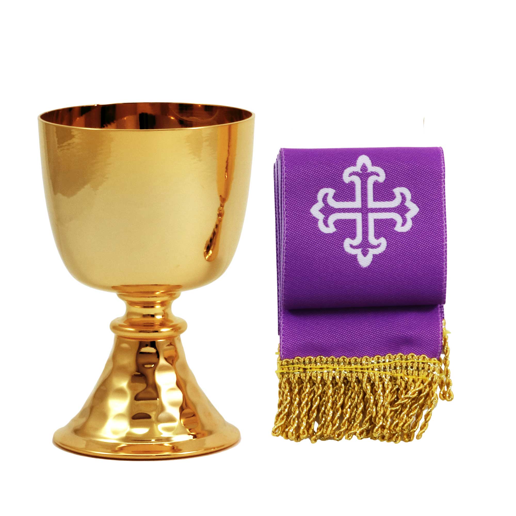 The item is complete with: - Chalice in gold-plated brass with hammered base. The chalice is 10.5 cm tall with a 6.5 cm diameter cup and can hold up to 120 ml of wine. - Asperges in silver-tone brass 11.5 cm with hermetic seal. - Saucer in gold-plated brass diameter 10 cm. -Host box in gold-plated brass with IHS engraving. The Pyx has a diameter of 8 cm and holds approximately 40 hosts. - Holy Oils stock in silver-tone brass with a cross engraved on the cap. - Cast altar with embossed grape and vine leaf decoration and equipped with a support for a cross and candles. - 125 ml water and wine bottles with protective armor and distinctive hand-enamelled plates. - Pastoral cross, pair of glass flame guards and wax candles with matching fabric candle holders. - Two-tone stole in purple and white fabric, 150 cm. - Set of 5pcs 100% cotton linens with gold-thread embroidered cross.