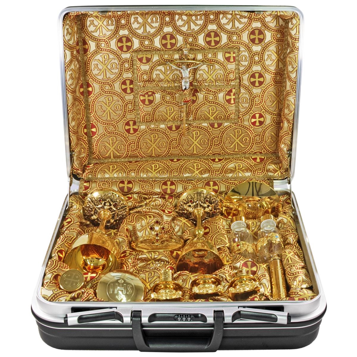 Valigia foderata internamente con pregiato broccato Alfa e Omega e completa di tutto il necessario per la Celebrazione.
