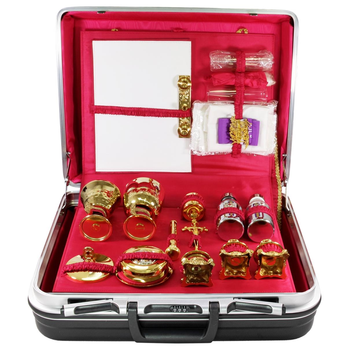 Valigia foderata internamente in tessuto color cremisi e completa di tutto il necessario per la Celebrazione.