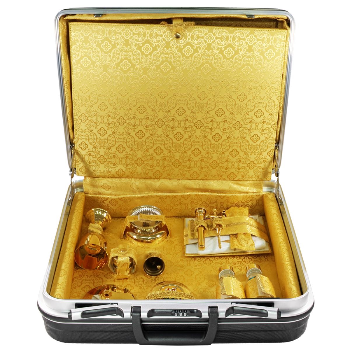 Valigia foderata internamente in Raso giallo e completa di tutto il necessario per la Celebrazione.