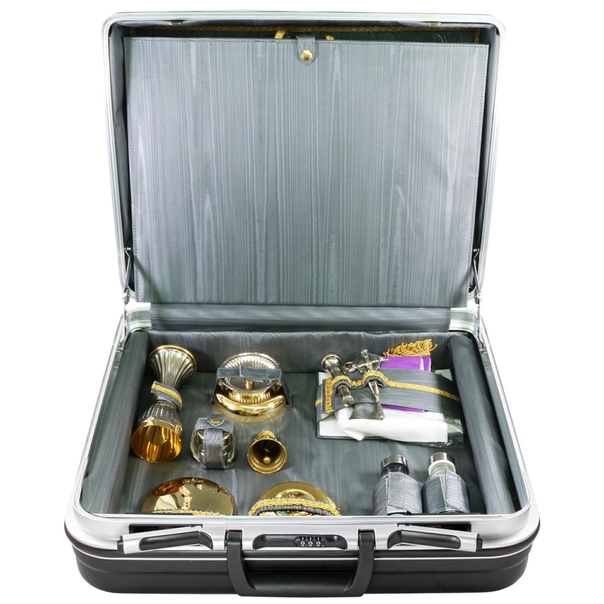 Valigia foderata internamente in Raso grigio e completa di tutto il necessario per la Celebrazione.