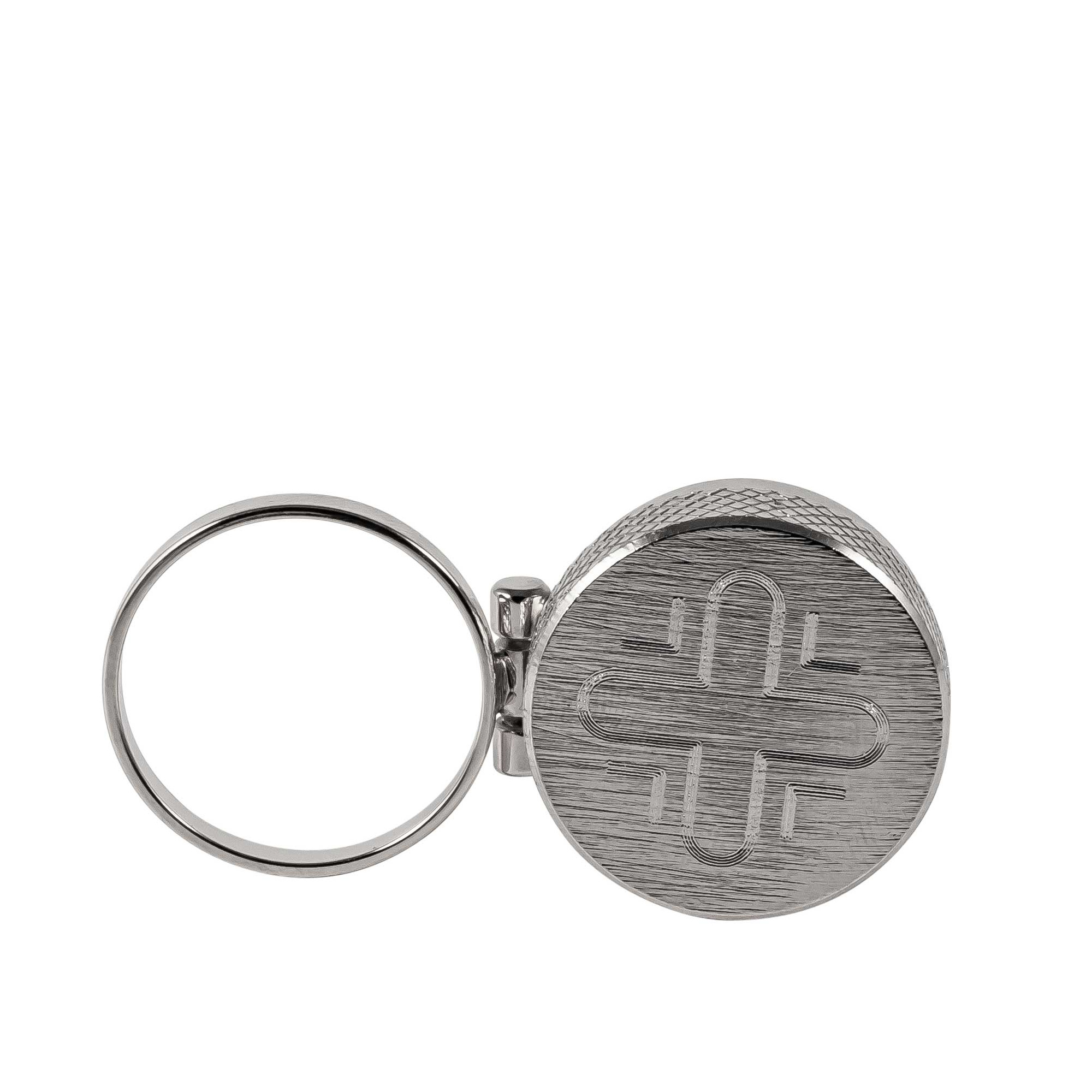 Astuccio in Raso rosso completo di vasetto in ottone tono argento per oli Santi con anello e croce incisa sul coperchio.