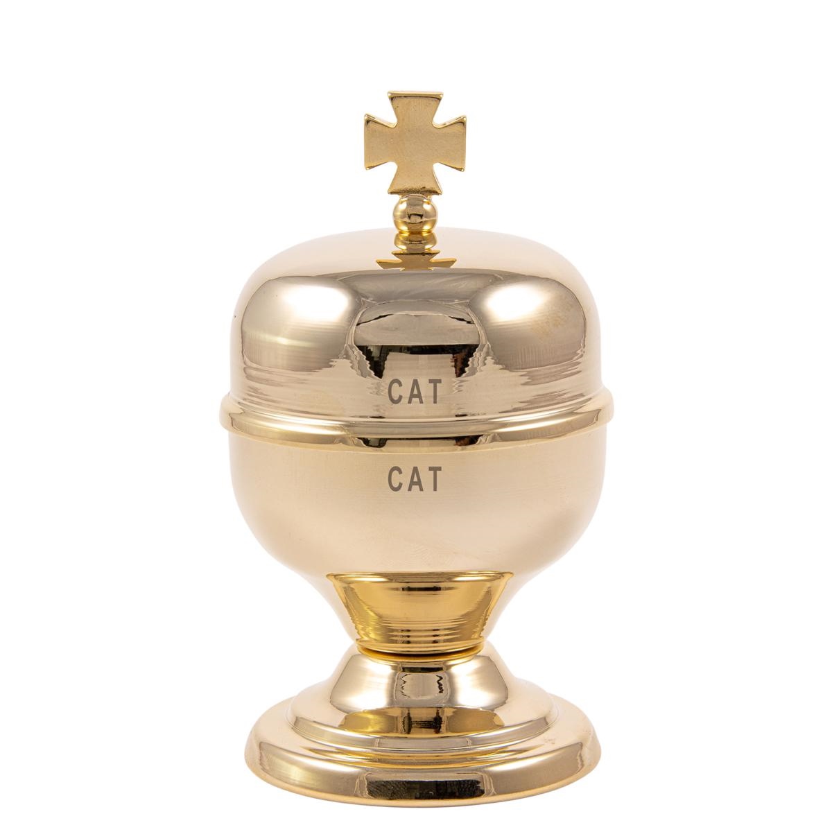 Vasetto per oli santi modello Crismera, in ottone dorato con interno in vetro.