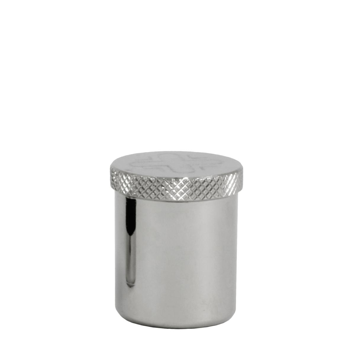 Silver-tone brass Holy Oil stocks with a cross engraved on the lid.